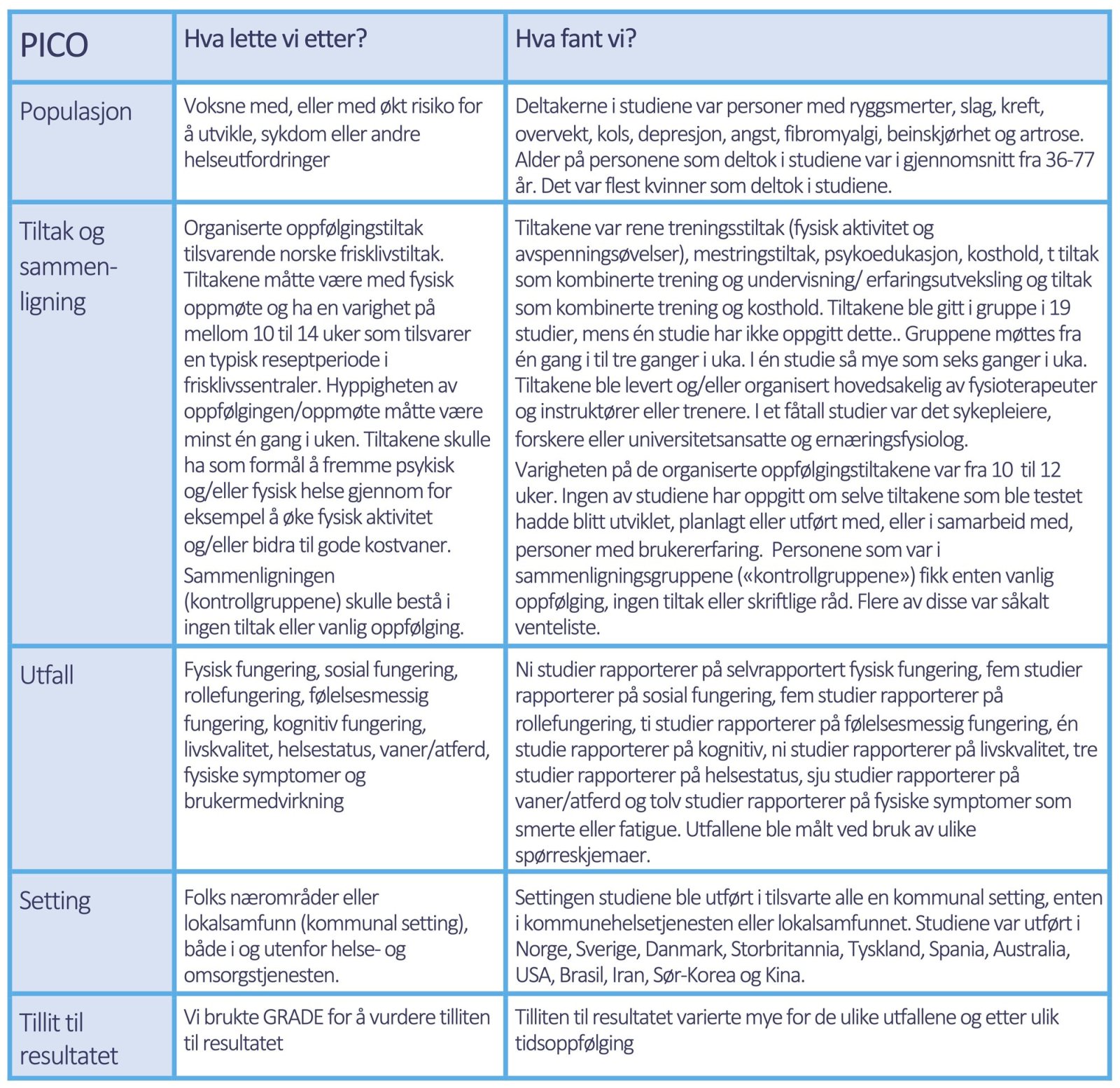 Vi har undersøkt effekten av helsefremmende og forebyggende tiltak som tilsvarer norske frisklivstiltak for personer med, eller med økt risiko for å utvikle, sykdom eller andre helseutfordringer. Tiltakene som ble undersøkt, skulle være organiserte oppfølgingstiltak som varte mellom ti og fjorten uker, og hadde minst ett ukentlig fysisk oppmøte.