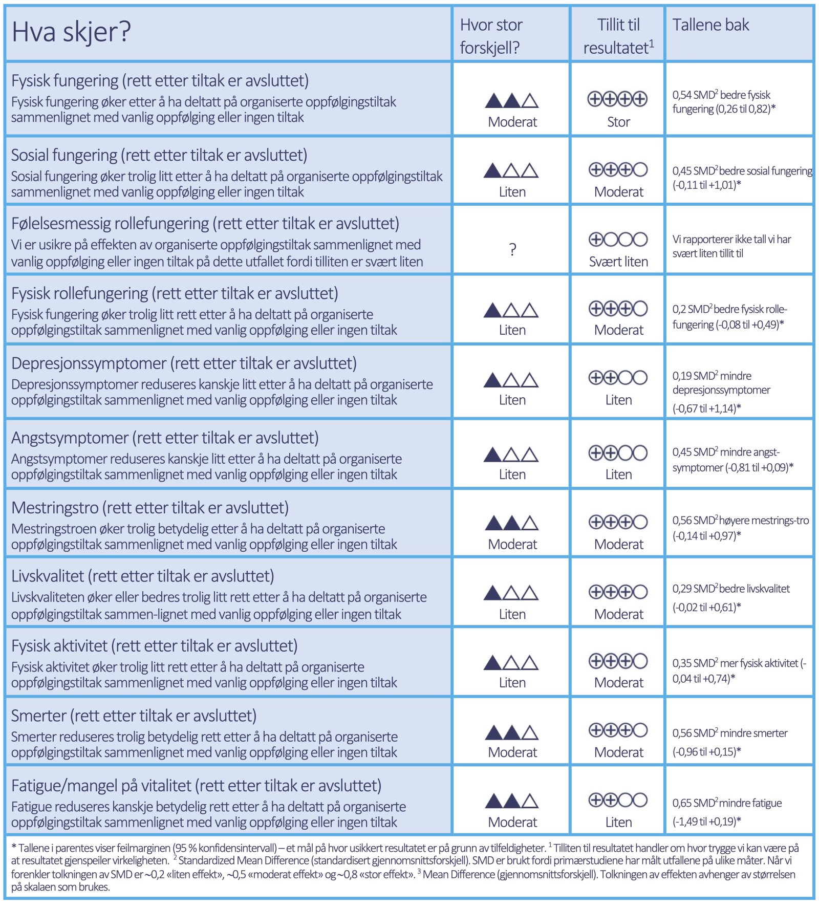 Organiserte oppfølgingstiltak ser ut til å ha en direkte positiv innvirkning på fysisk og sosial fungering, mestringstro og livskvalitet.