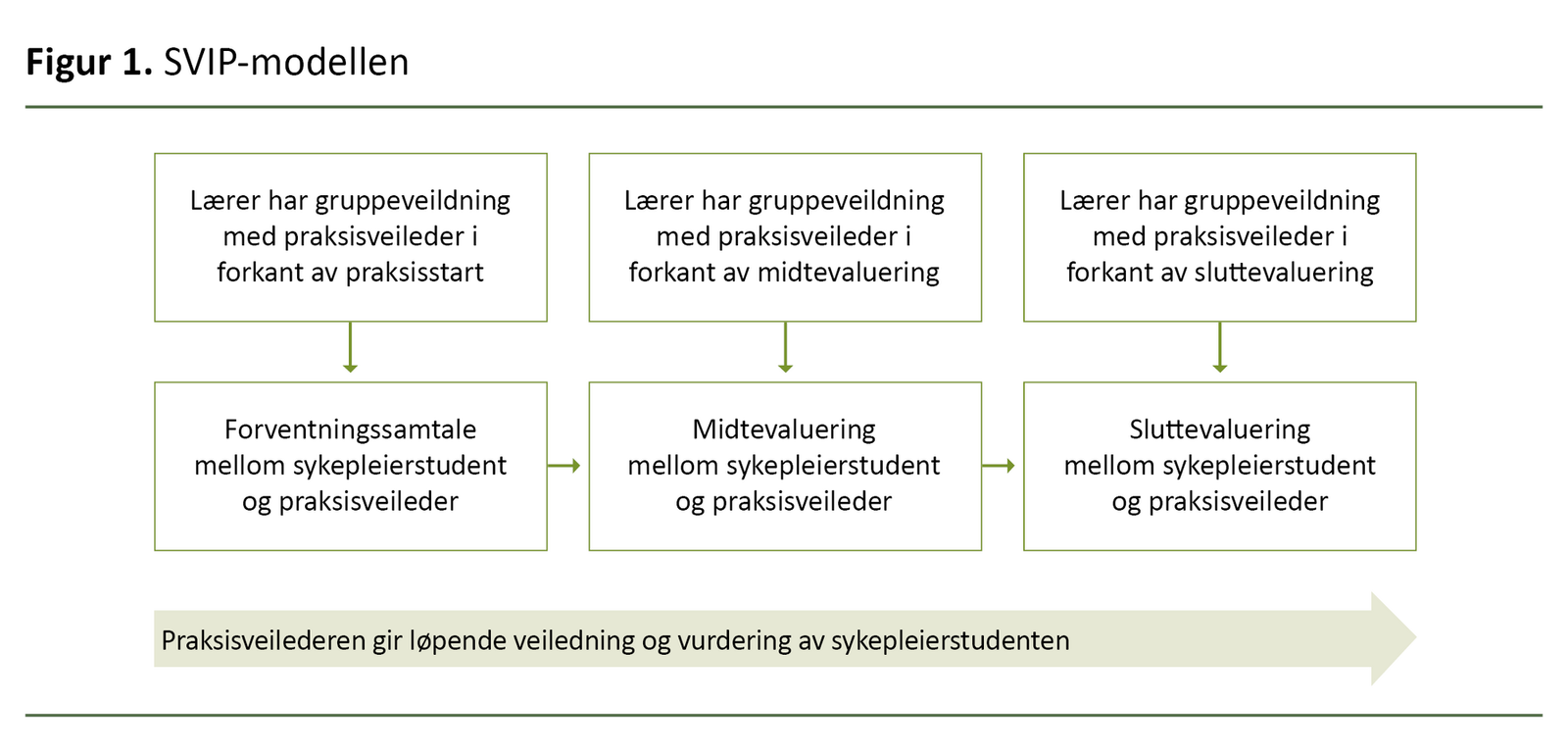 SVIP-modellen (7) er en av flere nye modeller som har blitt prøvd ut (8, 9). SVIP-modellen ble prøvd ut første gang ved daværende Høgskolen i Gjøvik i 2008 (7, 8). Noe av bakgrunnen for modellen var føringene i kvalitetsreformen, der forhold som studentenes læringsmiljø og styrket samarbeid mellom utdanningen og praksis ble vektlagt slik det kommer frem i St.meld. nr. 27 (2000–2001) (30).