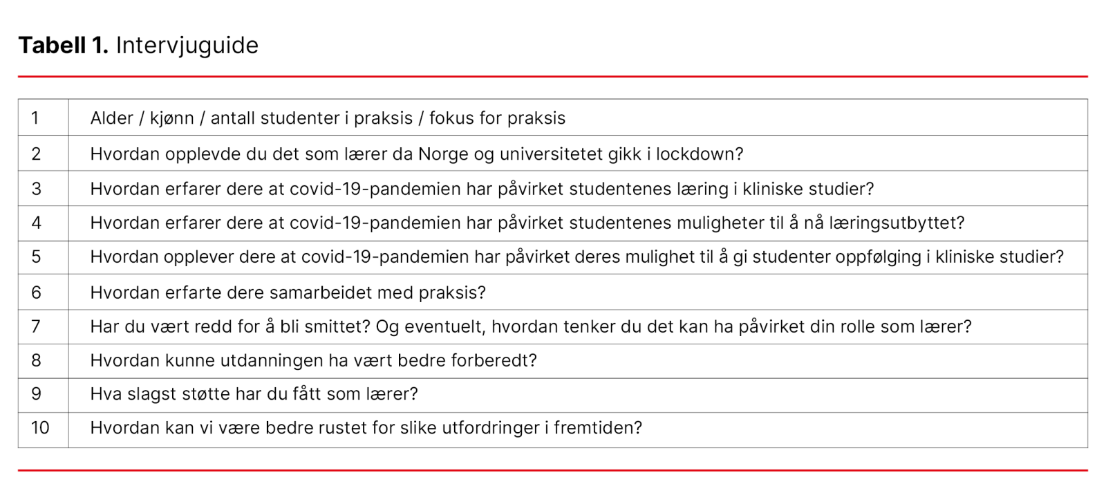 Tidligere studier har hovedsakelig fokusert på sykepleierstudenters erfaringer med læring og på belastningen ekstraarbeidet under covid-19-pandemien hadde på helsearbeidernes veiledning av studentene (16). Det er lite kunnskap om lærernes erfaringer med å følge opp studentene i kliniske studier.