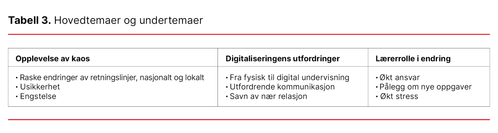 Hovedtemaene og undertemaene presenteres i tabell 3.