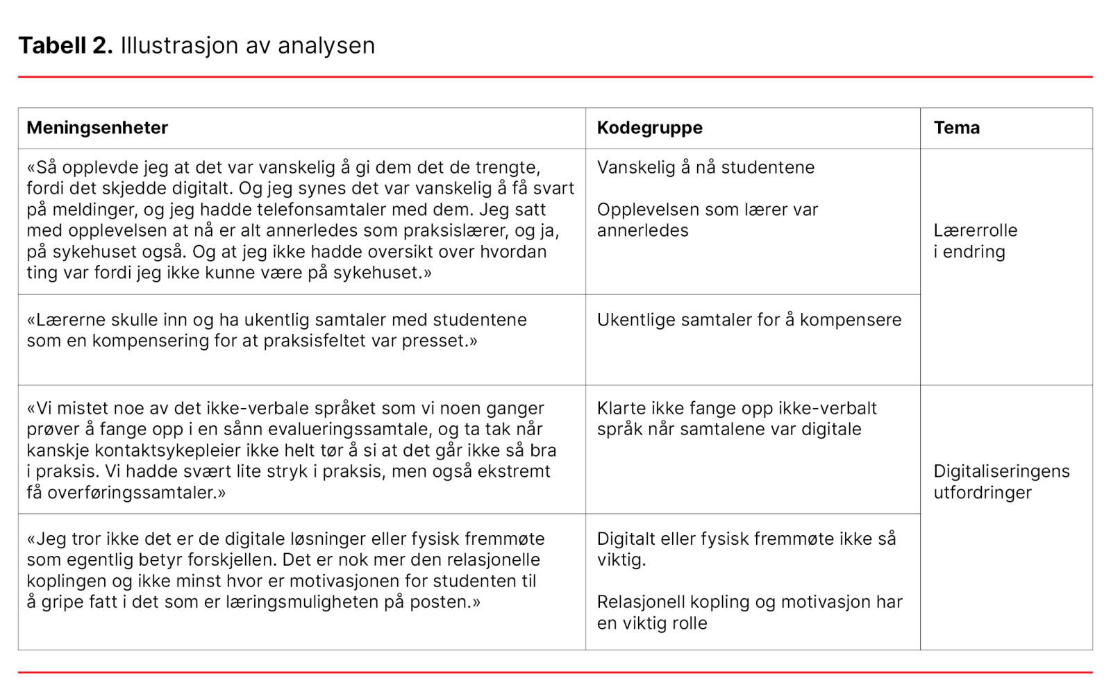 Metode: Vi gjennomførte fire fokusgruppeintervjuer med lærere som veiledet sykepleierstudenter i kliniske studier under covid-19-pandemien, ved et universitet i Sør-Norge. Dataene ble analysert ved tematisk analyse som beskrevet av Braun og Clark, noe som resulterte i følgende tre hovedtemaer: «Opplevelse av kaos», «Digitaliseringens utfordringer» og «Lærerrolle i endring».