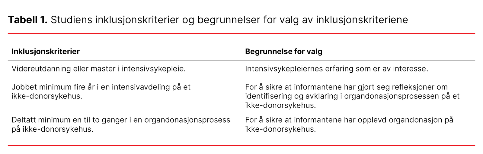 Tabell 1. Studiens inklusjonskriterier og begrunnelser for valg av inklusjonskriteriene