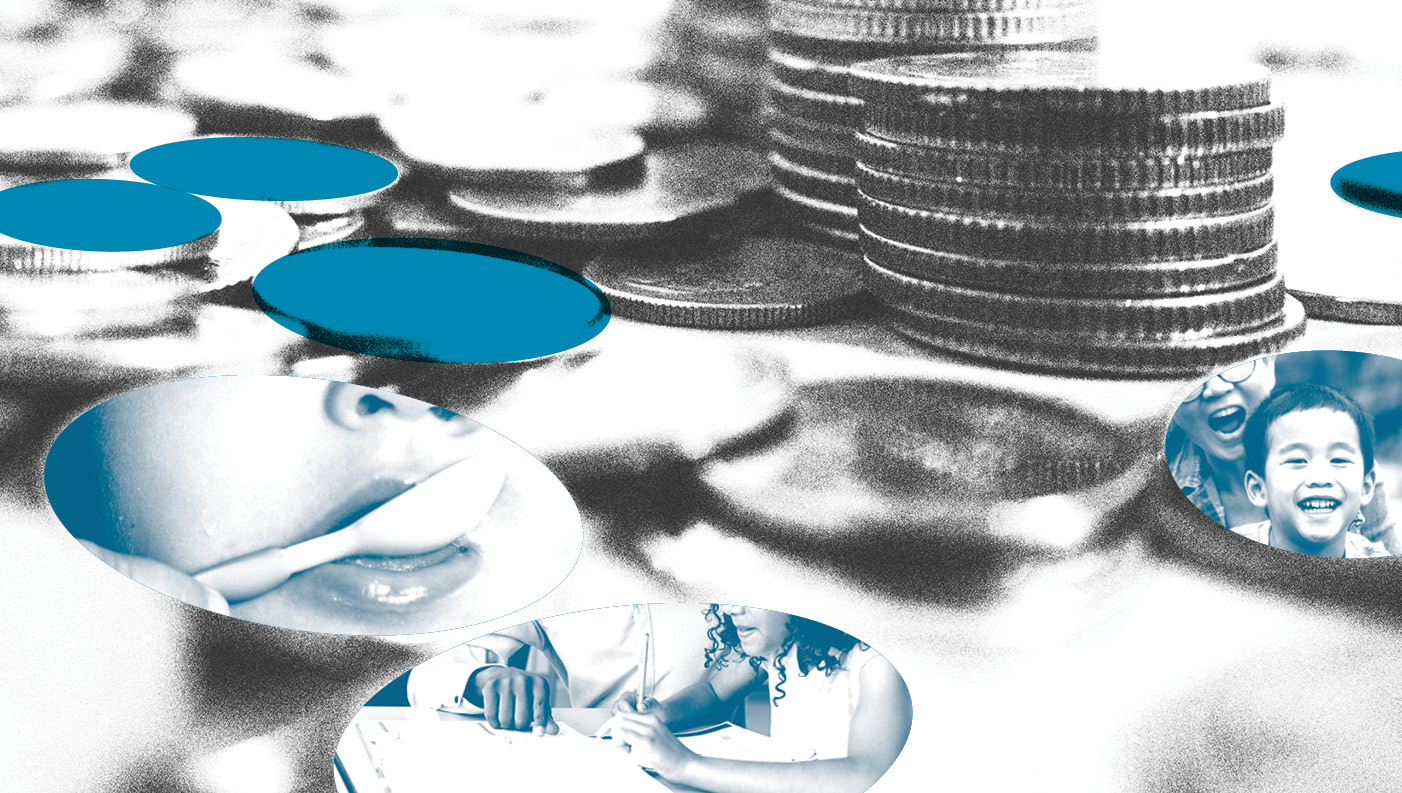 Illustrasjonen viser stabler med mynter. Innimellom er det sirkler med bilder av et barn som spiser, ei jente som skriver i en bok, og en gutt som ler sammen med sin far.