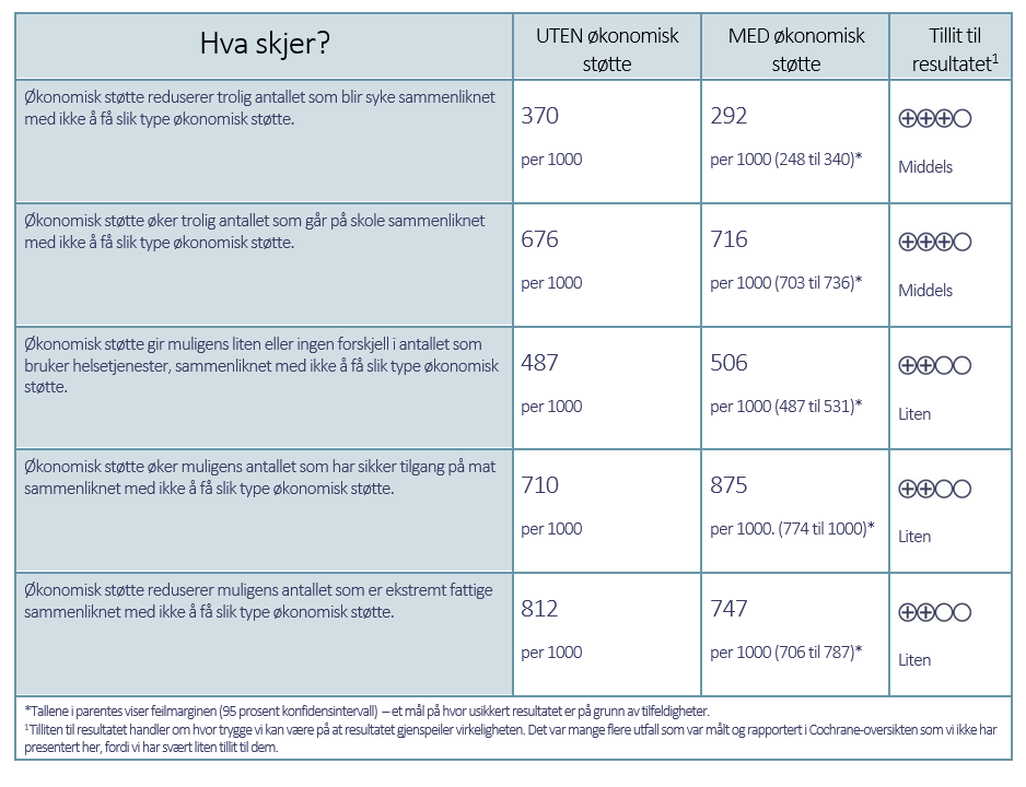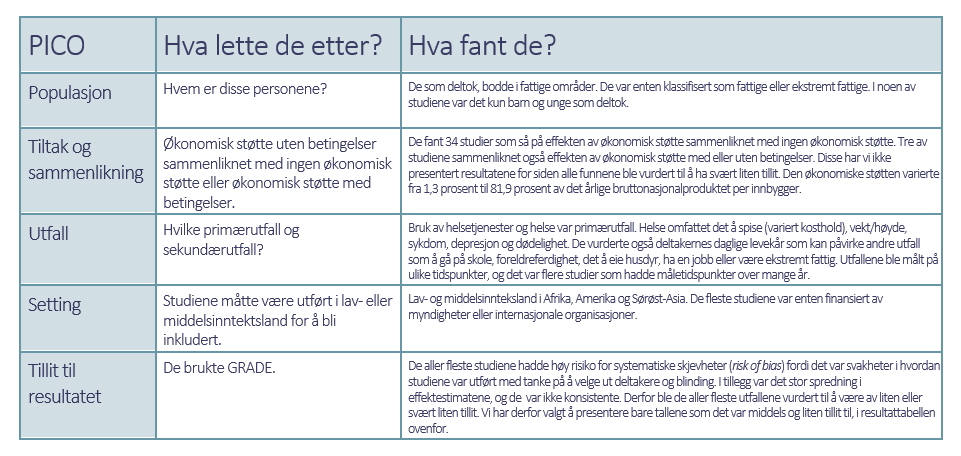I systematiske oversikter samles og vurderes tilgjengelig forskning. I denne systematiske Cochrane-oversikten var spørsmålet: «Hva er effekten av økonomisk støtte (uten betingelser) til personer som lever i fattigdom, sammenliknet med ikke å få slik type økonomisk støtte?»