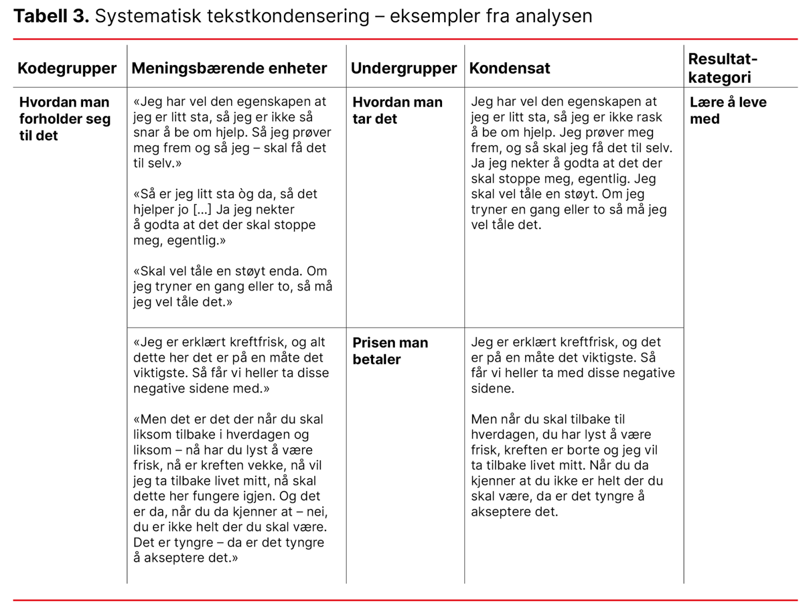 Til slutt sammenfattet vi funnene og presenterte dem i resultatkategorier. To hovedkategorier kom frem: «Kroppslige endringer» og «Lære å leve med». Flere underkategorier viste ulike aspekter av disse. Eksempler fra analyseprosessen vises i tabell 3.