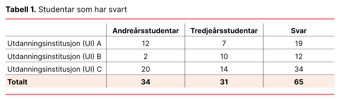 Studien nyttar kvalitativ metode og baserer seg på skriftlege svar på opne spørsmål i sjølvevalueringsverktøyet EPICC-Tool (1). I Noreg fekk sjukepleiarstudentar i bachelor i sjukepleie ved tre utdanningsinstitusjonar invitasjon til å delta i undersøkinga. Mellom august og oktober 2020 blei studentane førespurde om å delta via skriftleg invitasjon på institusjonane sine digitale informasjons- og læringsplattformer.