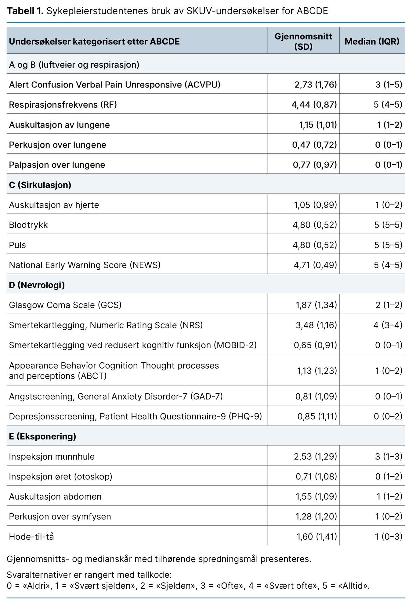 Svaralternativene er basert på Likert-skala (0 = «Aldri», 1 = «Svært sjelden», 2 = «Sjelden», 3 = «Ofte», 4 = «Svært ofte», 5 = «Alltid») (17). I resultatene angis gjennomsnittlig og median skåringsverdi ≥ 2,5 som regelmessig, og < 2,5 som sjelden bruk av undersøkelsene.