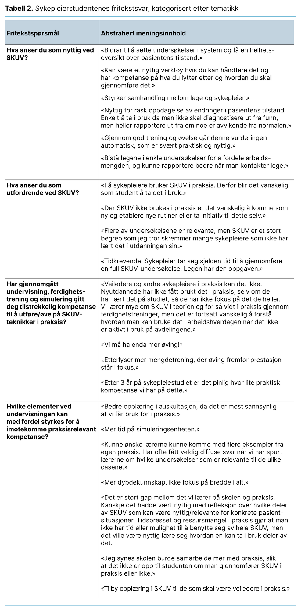 Flere av respondentene argumenterte for at SKUV var nyttig for å kunne oppnå en systematisk helhetsoversikt over pasientens tilstand, og som gunstig for samhandling mellom sykepleiere og leger. De ga også uttrykk for at det var flere hindre for å ta i bruk SKUV. Flere mente at det er få sykepleiere i praksisfeltet som benytter SKUV, og de mangler tid til å bruke verktøyet. Flere av undersøkelsene ble ansett som legeoppgaver, og som student var det krevende å ta initiativ til å etablere nye rutiner i praksisfeltet (tabell 2).