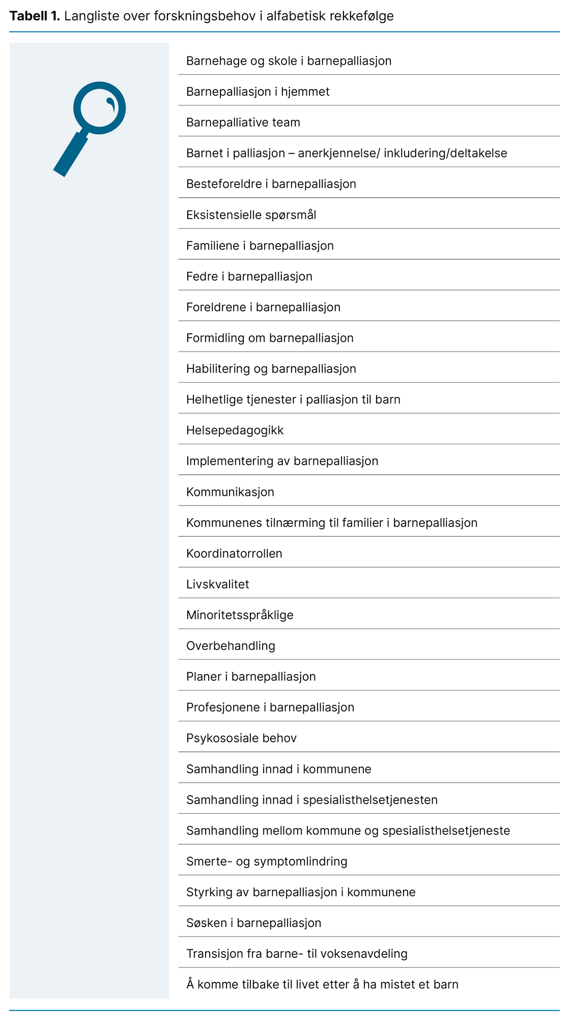 Hensikten med denne studien var derfor å identifisere forslag til forskningsbehov innenfor barnepalliasjon i Norge og å presentere en topp ti-liste med de foreslåtte prioriterte forskningsområdene.