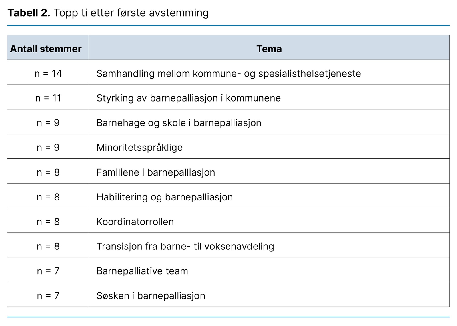 For å rangere de temaene som hadde fått like mange stemmer, gjennomførte vi umiddelbart en ny avstemming mellom niende plass (barnepalliative team) og tiende plass (søsken i barnepalliasjon), mellom femte (familiene i barnepalliasjon), sjette (habilitering og barnepalliasjon), sjuende (transisjon fra barne- til voksenavdeling) og åttende plass (koordinatorrollen), og mellom tredje (barnehage og skole i barnepalliasjon) og fjerde plass (minoritetsspråklige). Tabell 3 viser den endelige listen over de topp ti rangerte forskningsbehovene innenfor barnepalliasjon i Norge.