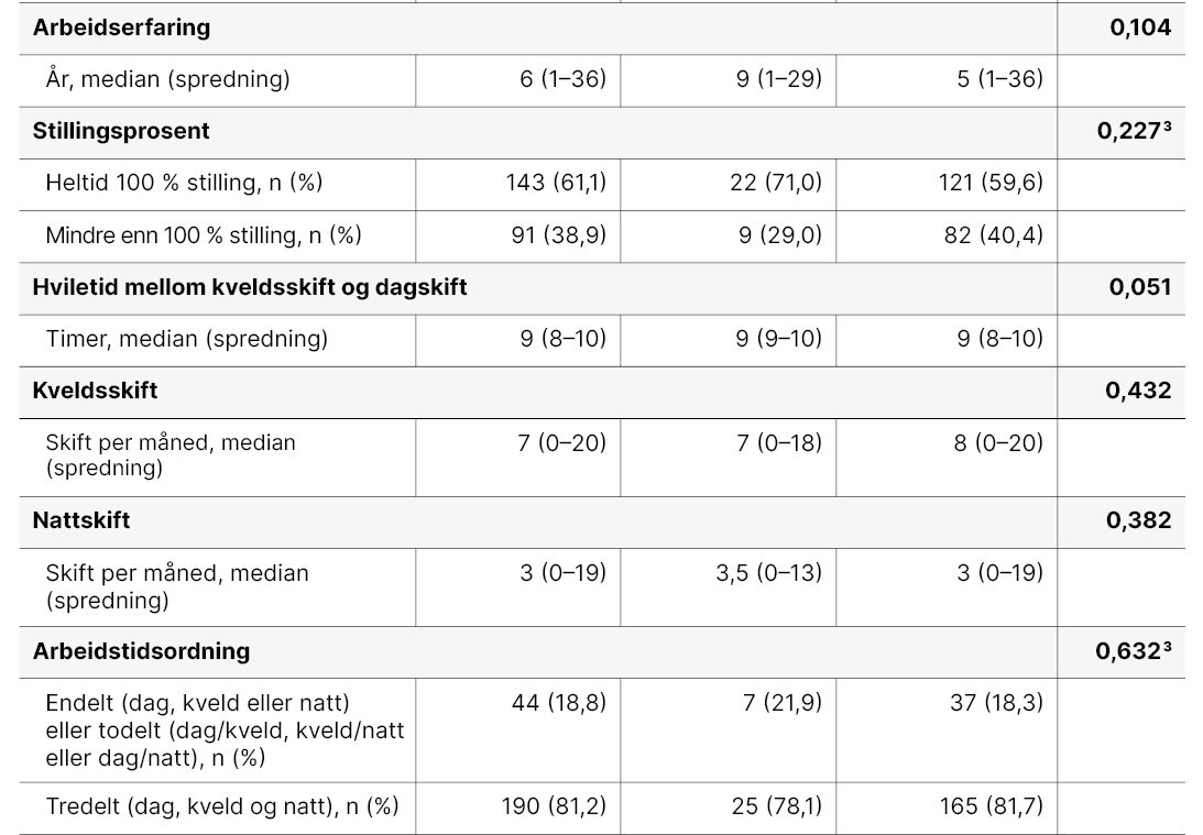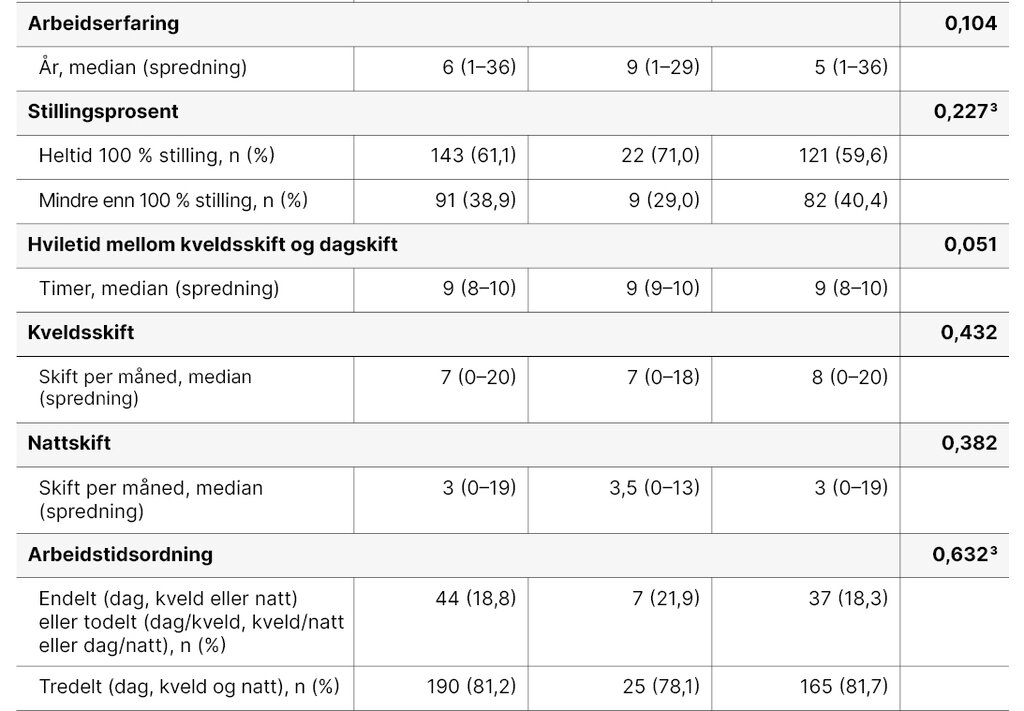 Tabell 1 viser hvordan sosiodemografiske og arbeidsrelaterte data er fordelt mellom gruppene av de som rapporterte om god søvnkvalitet og dårlig søvnkvalitet. Det var ingen forskjell i alder eller mellom kjønn på selvrapportert søvnkvalitet. Det var heller ingen forskjeller i arbeidserfaring, stillingsprosent, hviletid mellom kvelds- og dagskift, antallet kvelds- eller nattskift, arbeidstidsordning eller turnusmedvirkning.