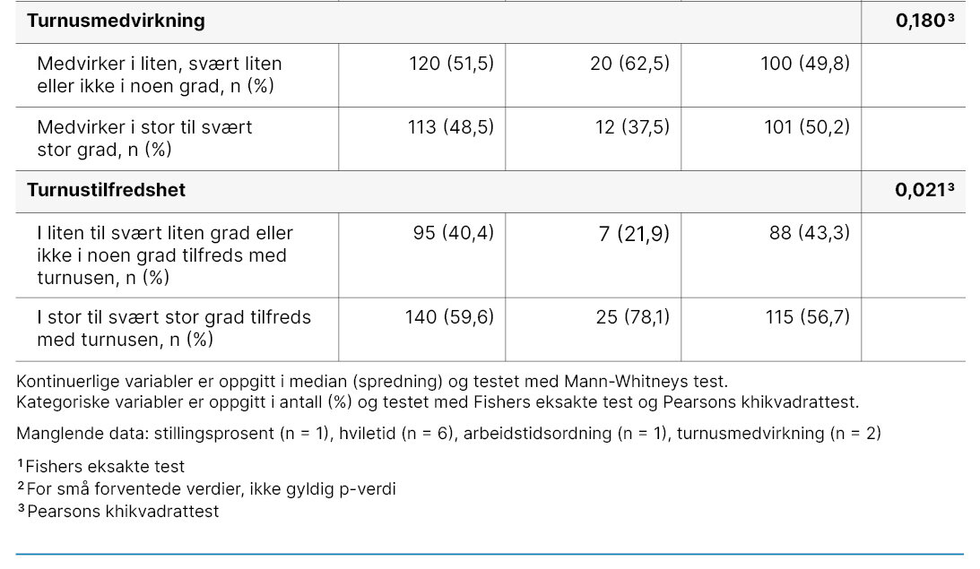 I utvalget oppga 51,5 prosent av deltakerne (120/235) at de medvirket i utarbeidelsen av sin turnus i liten, svært liten eller ingen grad. Av deltakerne oppga 59,6 prosent (140/235) at de var tilfreds med sin turnus i stor eller i svært stor grad. Demografiske og arbeidsrelaterte data presenteres nærmere i tabell 1.