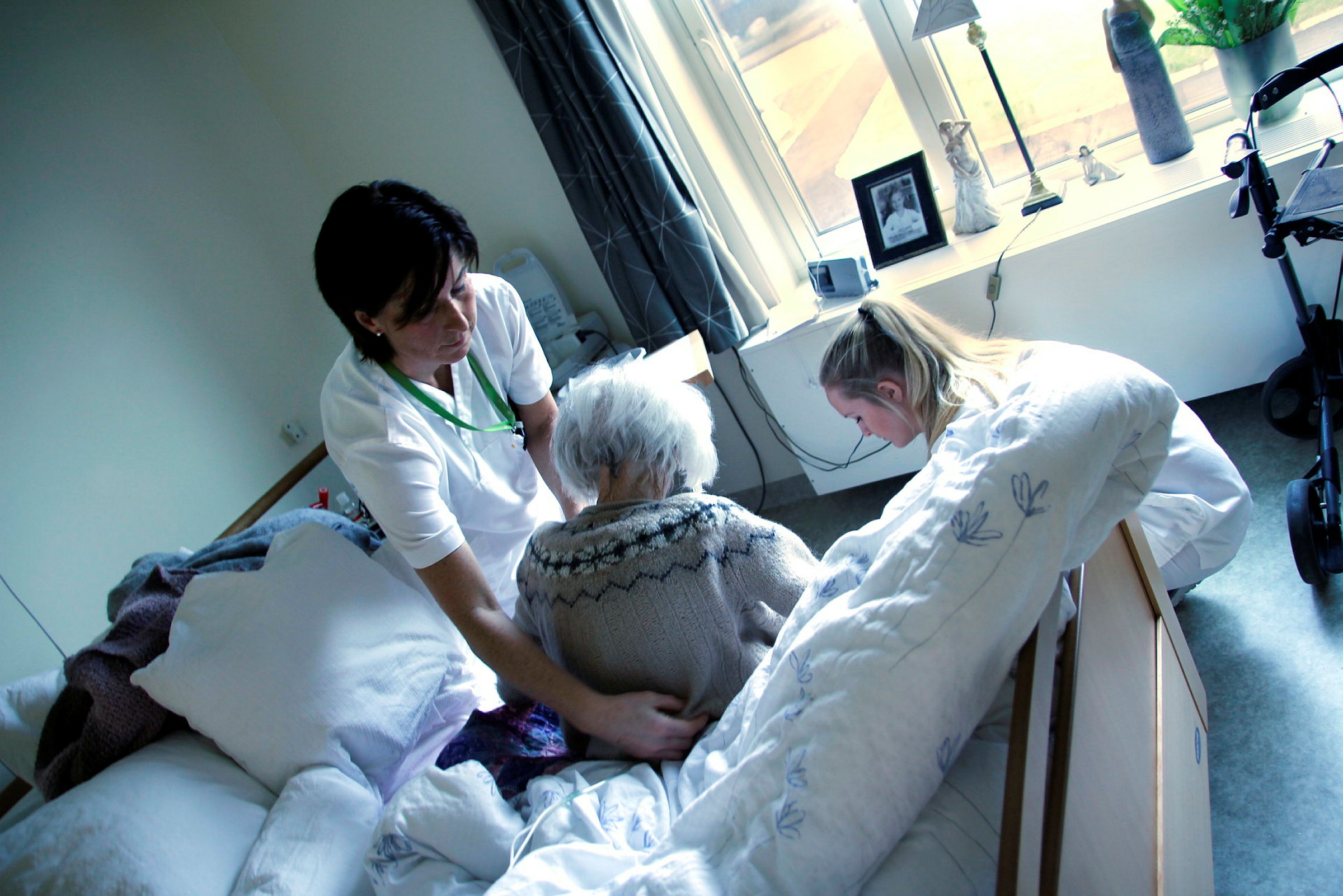 Bildet viser to sykepleiere som hjelper en pasient i sengen hennes på Karmøy sykehjem.