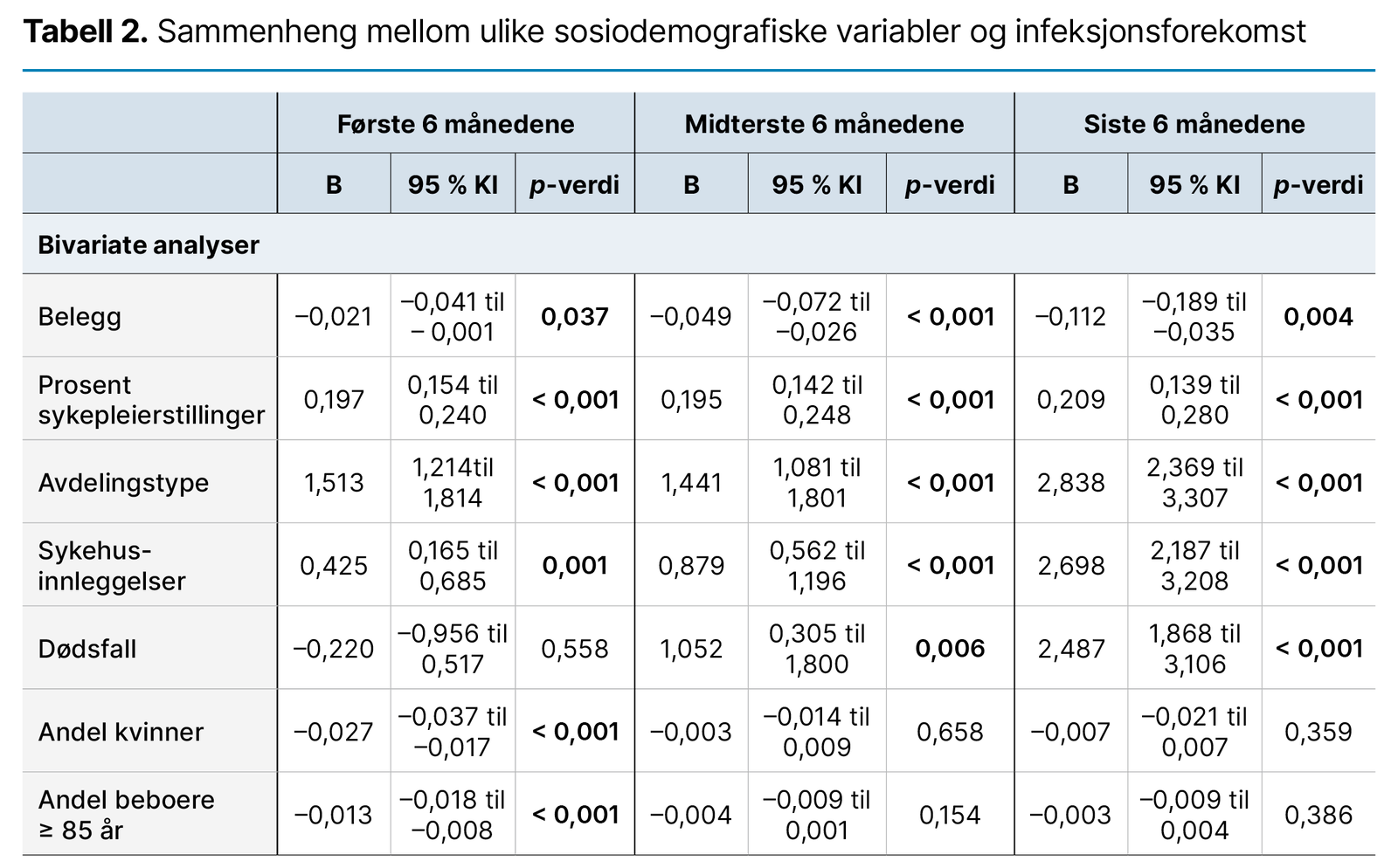 Resultatene fra regresjonsanalysene viser forskjellige signifikante resultater gjennom de tre ulike seksmånedersperiodene. Resultatene viser at høye infeksjonstall opptrer samtidig som antallet sykehusinnleggelser er høyt, som er den eneste variabelen som er signifikant gjennom hele perioden (tabell 2).