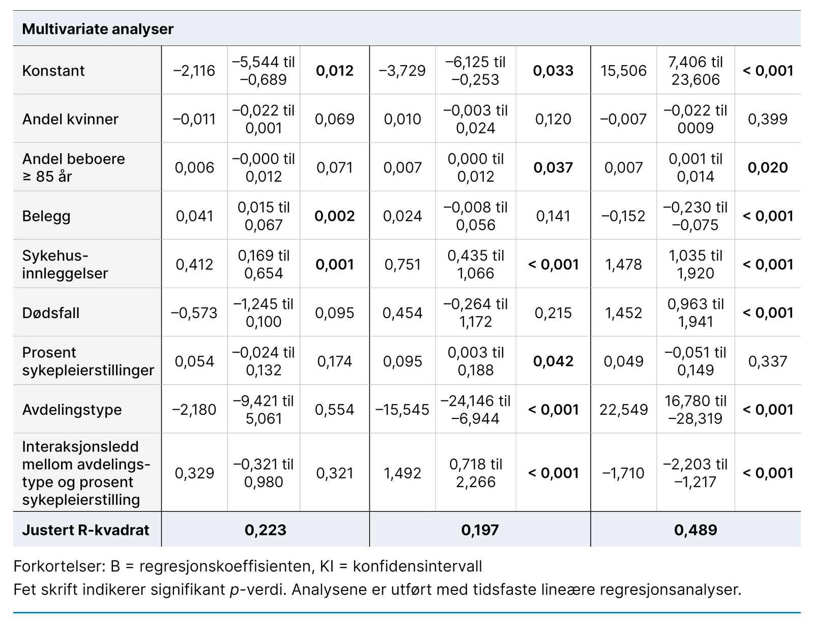 Alle signifikante variabler i bivariate analyser på et av de tre tidspunktene ble inkludert trinnvis i en multippel regresjonsanalyse for hver tidsperiode. Antallet infeksjoner som ble rapportert hver uke, ble brukt som avhengig variabel. Et interaksjonsledd mellom «type avdeling» og «prosent sykepleierstilling» ble inkludert i regresjonsanalysen.