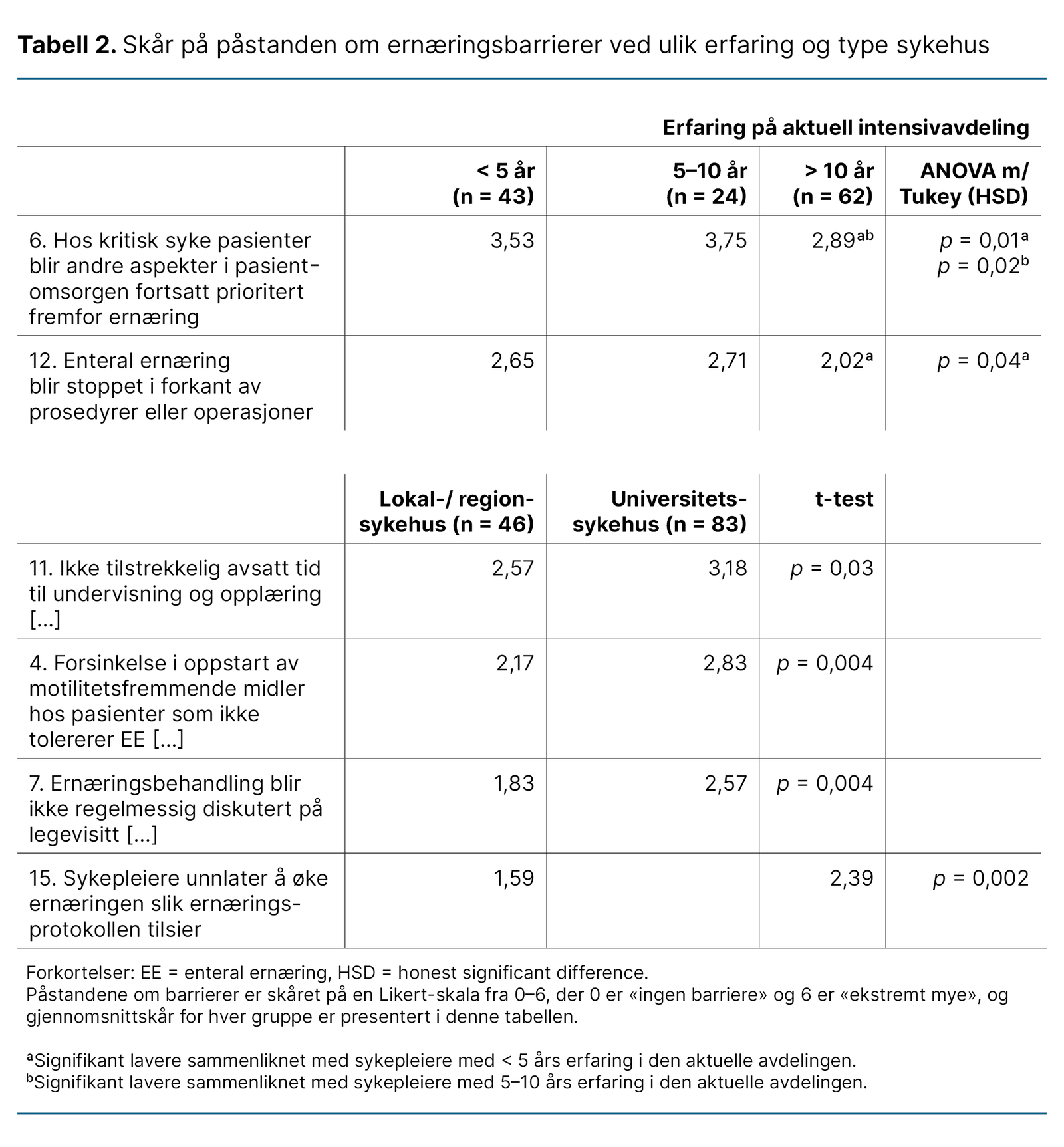 Barrieren «Hos kritisk syke pasienter blir andre aspekter i pasientomsorgen fortsatt prioritert fremfor ernæring» skåret lavere (p < 0,05) hos sykepleiere med over 10 års erfaring sammenliknet med gruppene som hadde 5–10 og 0,5–10 års erfaring.