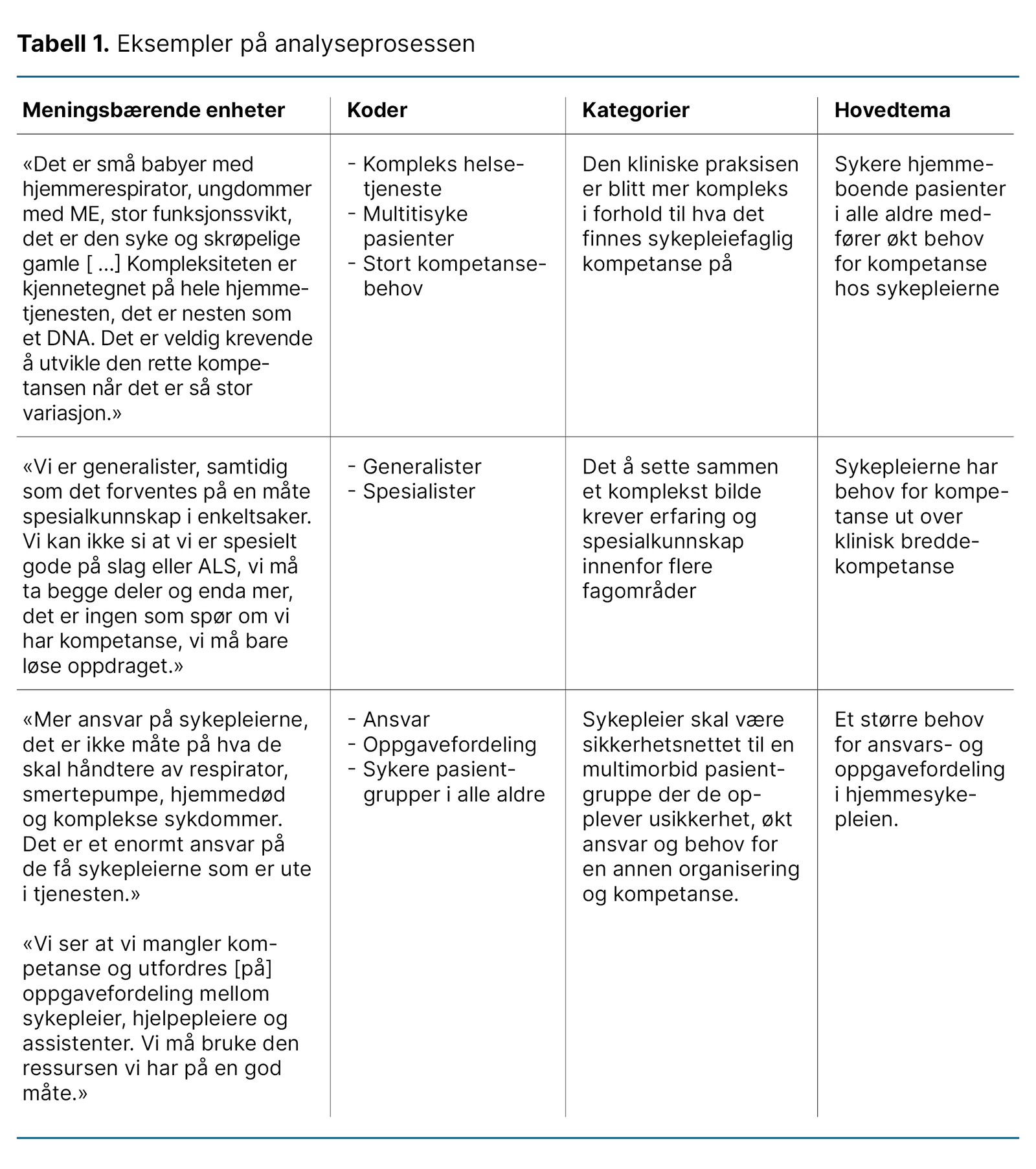 Vi identifiserte tre hovedtemaer: 1) «Sykere hjemmeboende pasienter i alle aldre medfører økt behov for kompetanse hos sykepleierne», 2) «Sykepleierne har behov for kompetanse ut over klinisk breddekompetanse» og 3) «Et større behov for ansvars- og oppgavefordeling i hjemmesykepleien».