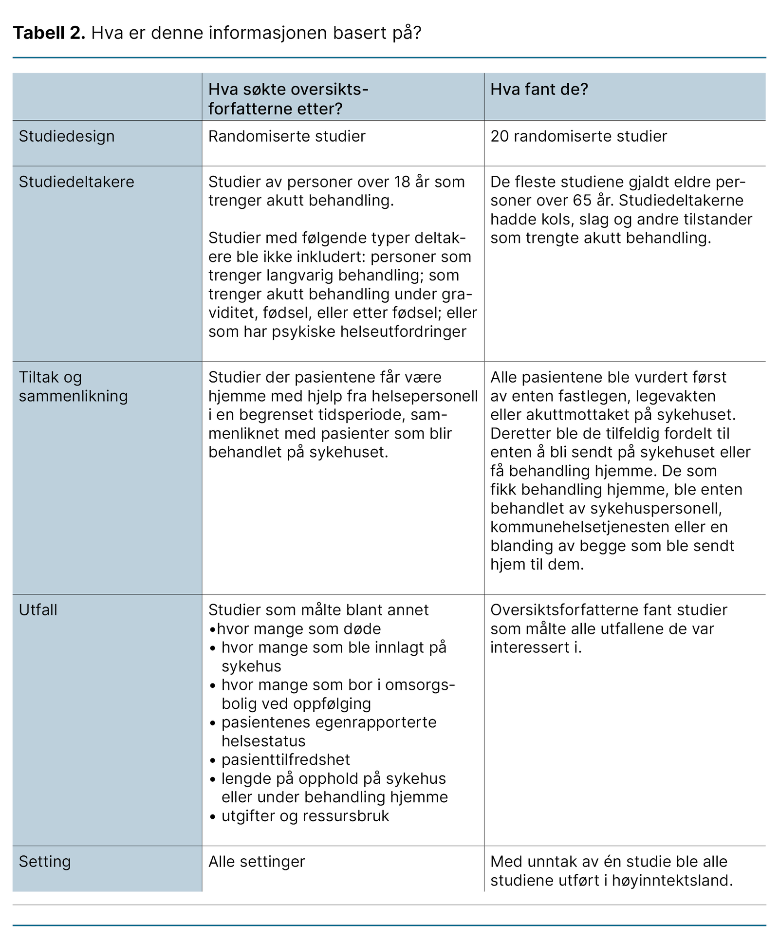 I systematiske oversikter samles og vurderes tilgjengelig forskning. I denne systematiske Cochrane-oversikten søkte forskerne etter kvantitative studier som kunne svare på spørsmålet: «Hva er effekten av å få hjemmebasert sykehusbehandling for personer i akutte helsesituasjoner?»