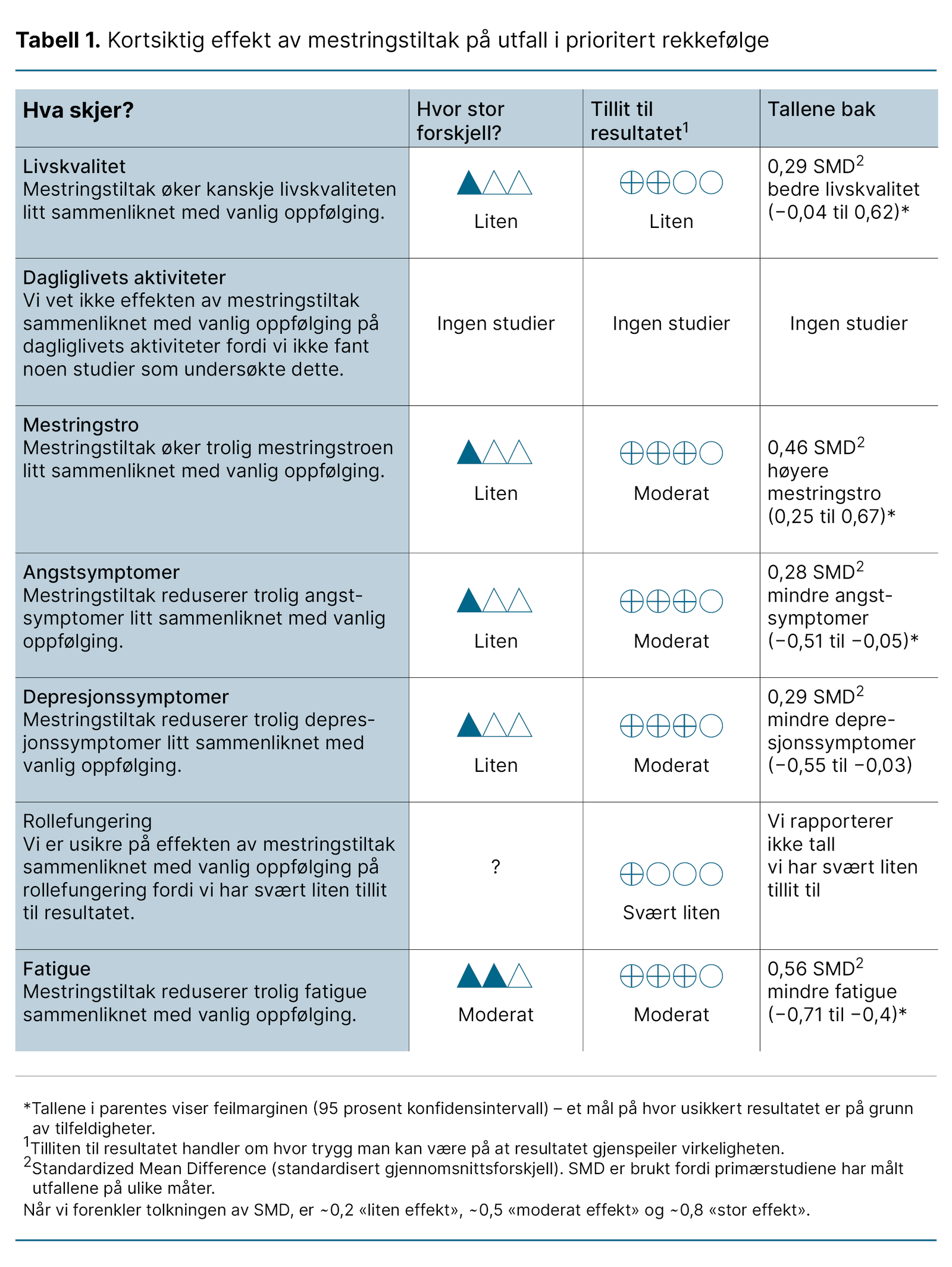 Mestringstiltak kan muligens gi dem bedre livskvalitet. De positive effektene vises trolig som økt mestringstro og reduksjon i fatigue, angst- og depresjonssymptomer.