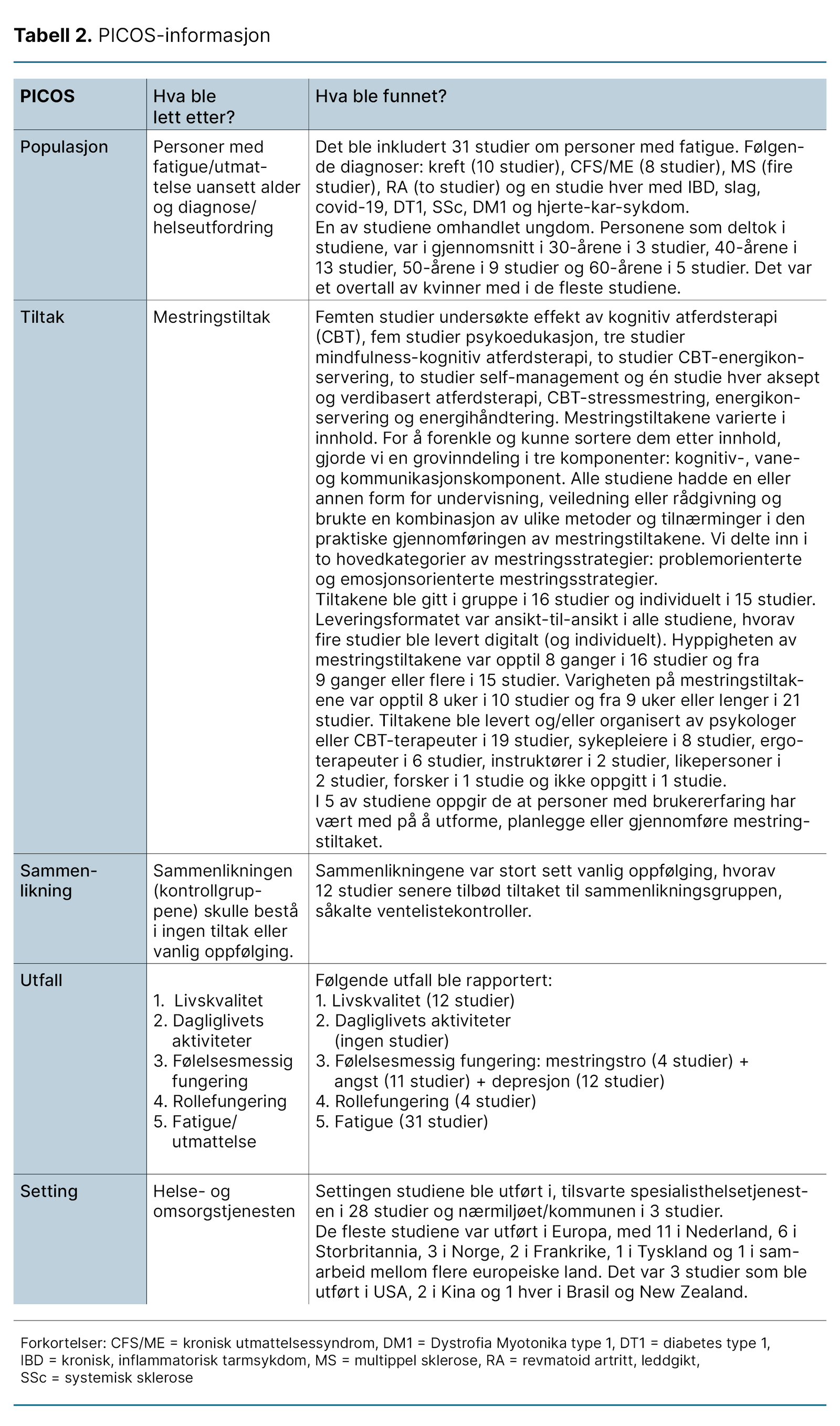 Mestringstiltakene ble stort sett gitt i en spesialisert setting som sykehus, medisinsk senter eller klinikk. Mestringstiltakene ble sammenliknet med vanlig oppfølging. Det ble søkt etter randomiserte kontrollerte studier i Cochrane CENTRAL oppdatert til mars 2025, og 31 randomiserte kontrollerte studier som oppfylte kriteriene, ble inkludert. Tabell 2 viser hva det ble lett etter, og hva som ble funnet.