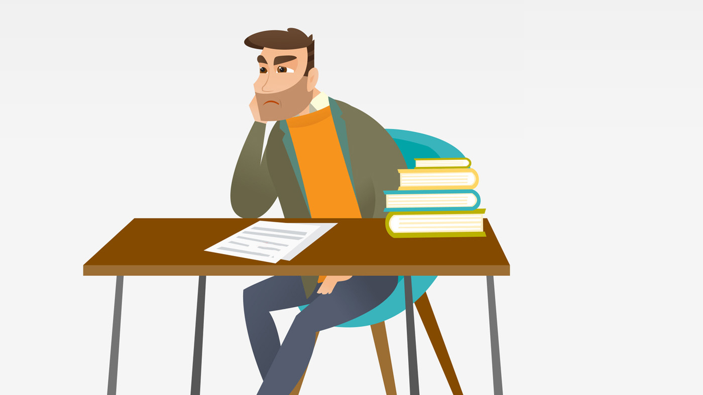 Illustrasjonen viser en mann som sitter ved et skrivebord. På skrivebordet ligger en bunke bøker, og noen papirer ligger foran ham. Han ser misfornøyd ut