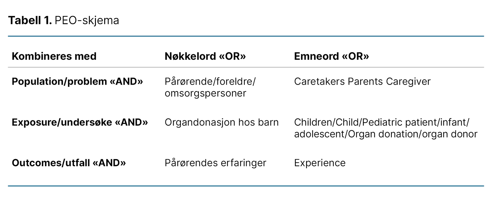 Definerte søkeord ble lagt inn i et Population, Exposure, Outcome-skjema (PEO-skjema) (tabell 1). Det initiale litteratursøket ble utført i databasene Cinahl, Embase og Medline frem til 17. januar 2024. Håndsøk i Inspira, Sykepleien Forskning, Nordisk sygeplejeforskning og Svemed+ ga ingen resultater.