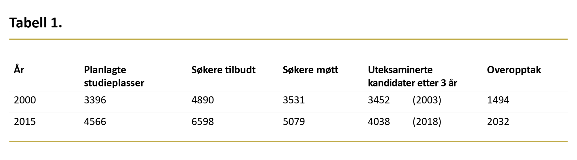 I tabellen nedenfor kommer det tydelig frem at veksten av studieplasser og overopptak ikke har så stor effekt på antall uteksaminerte sykepleiere. Vi tror at det i stor grad skyldes at overopptaket økte med nesten 30 prosent fra 2000 til 2015.