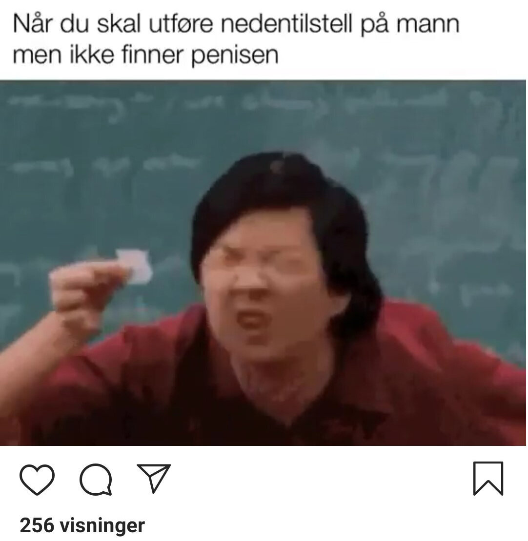 Vi har registrert kontoer med opptil 23 000 daglige følgere som poster memer (bilder, video eller tekst som spres digitalt) med humoristisk innhold. Kontoene driftes av sykepleierstudenter og sykepleiere der mye av innholdet går på bekostning av pasienter og pårørende. Og da er det verken morsomt eller etisk forsvarlig.