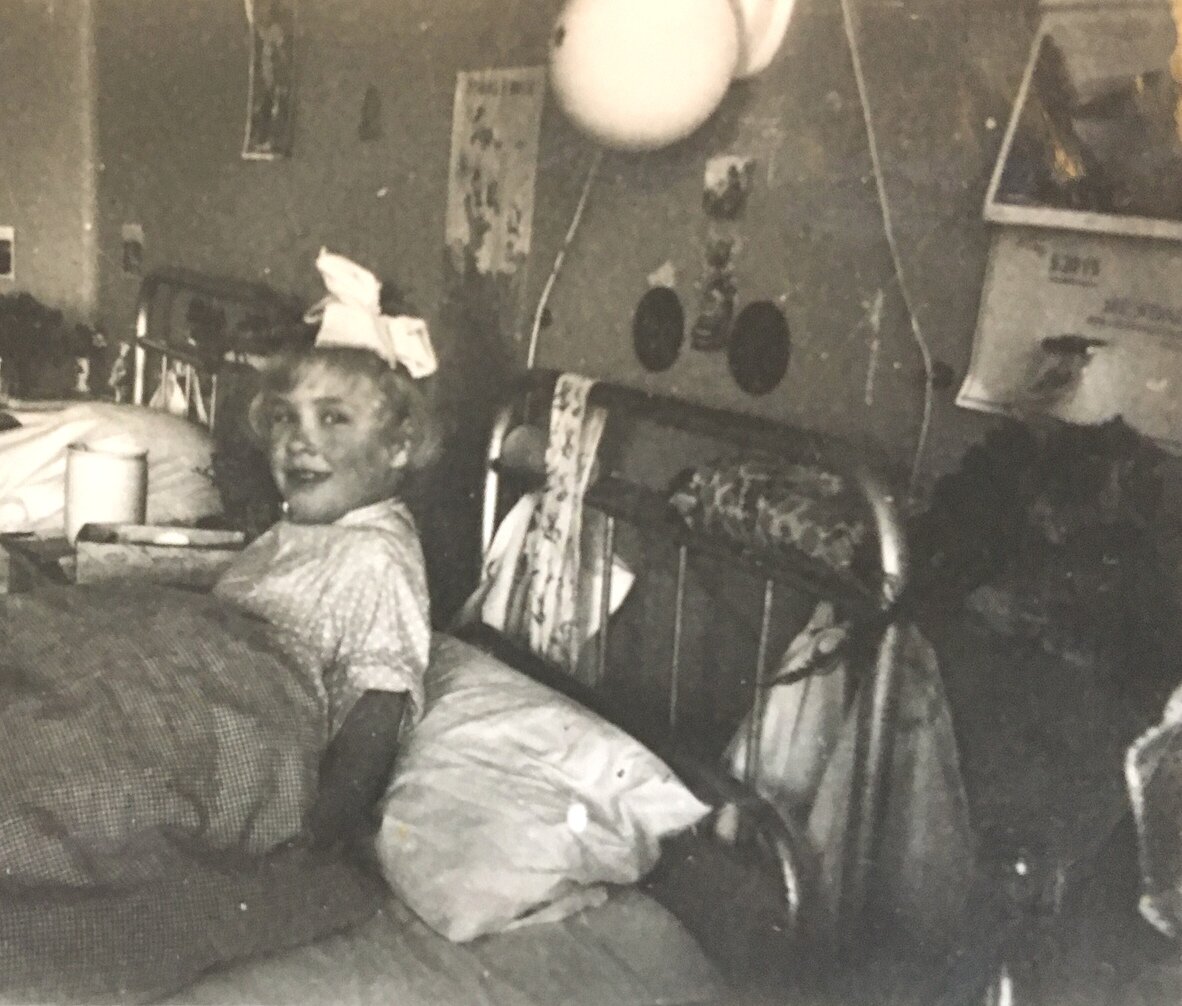 På sjukehuset var eg ikkje ute av senga på eit og eit halvt år. Alt skjedde der, også tannlegebesøk, vask og måltid. Alle på sjukehuset var vennlege og snille: dei las for oss borna, vi fekk utdelt godteri på faste dagar, vi song og hadde ulike aktivitetar i senga, men ingen av pleiarane ga oss godnattklem eller strauk på oss. Vi var åtte born på rommet, og sidan eg var ein av dei eldste, fekk eg ikkje hjelp til vask eller tannpuss. Det klarte eg sjølv, men eg syntest det såg koseleg ut når dei andre borna vart vaska i ansiktet av pleiarane – det var som å få eit kjærteikn.