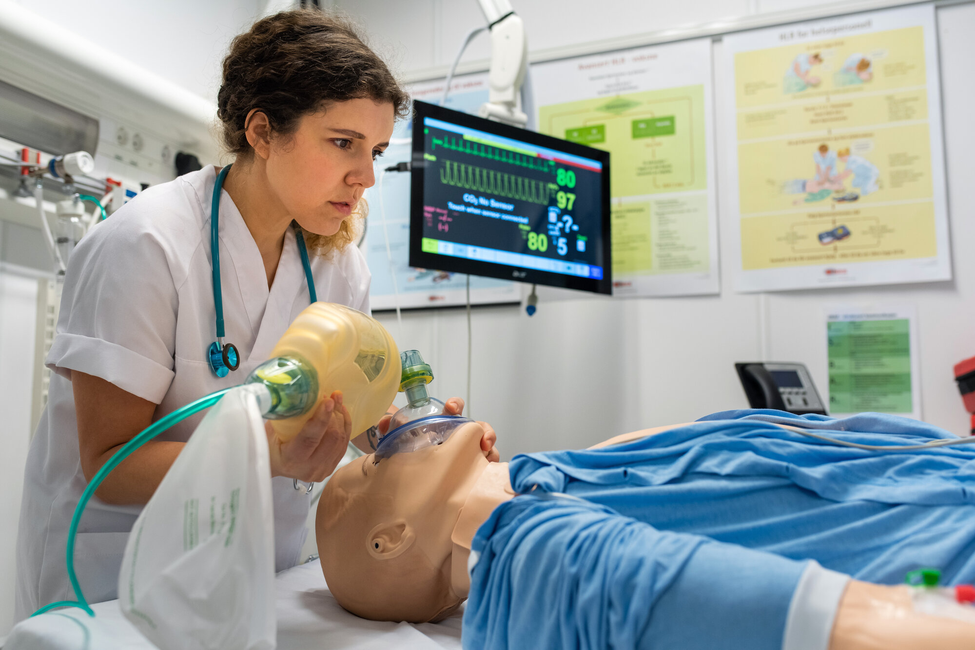 Bildet viser en sykepleierstudent som øver seg på en pasientdukke