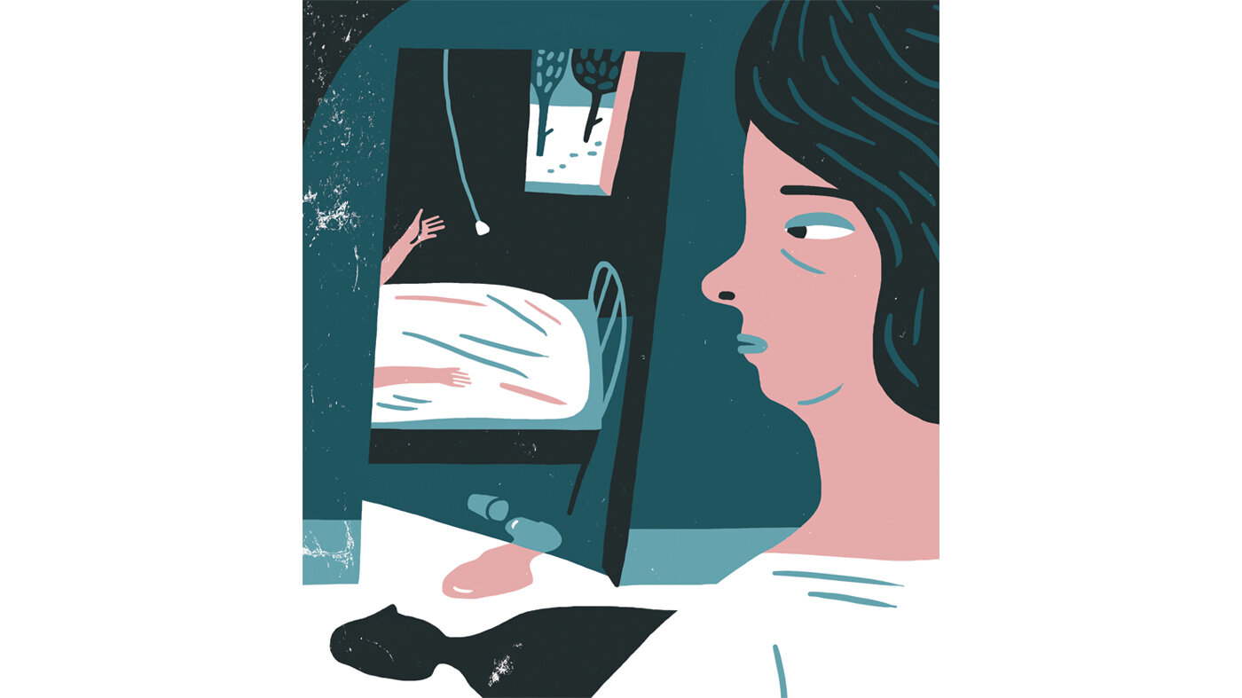 Illustrasjonen viser en sykepleier som står utenfor et pasientrom og ser inn.