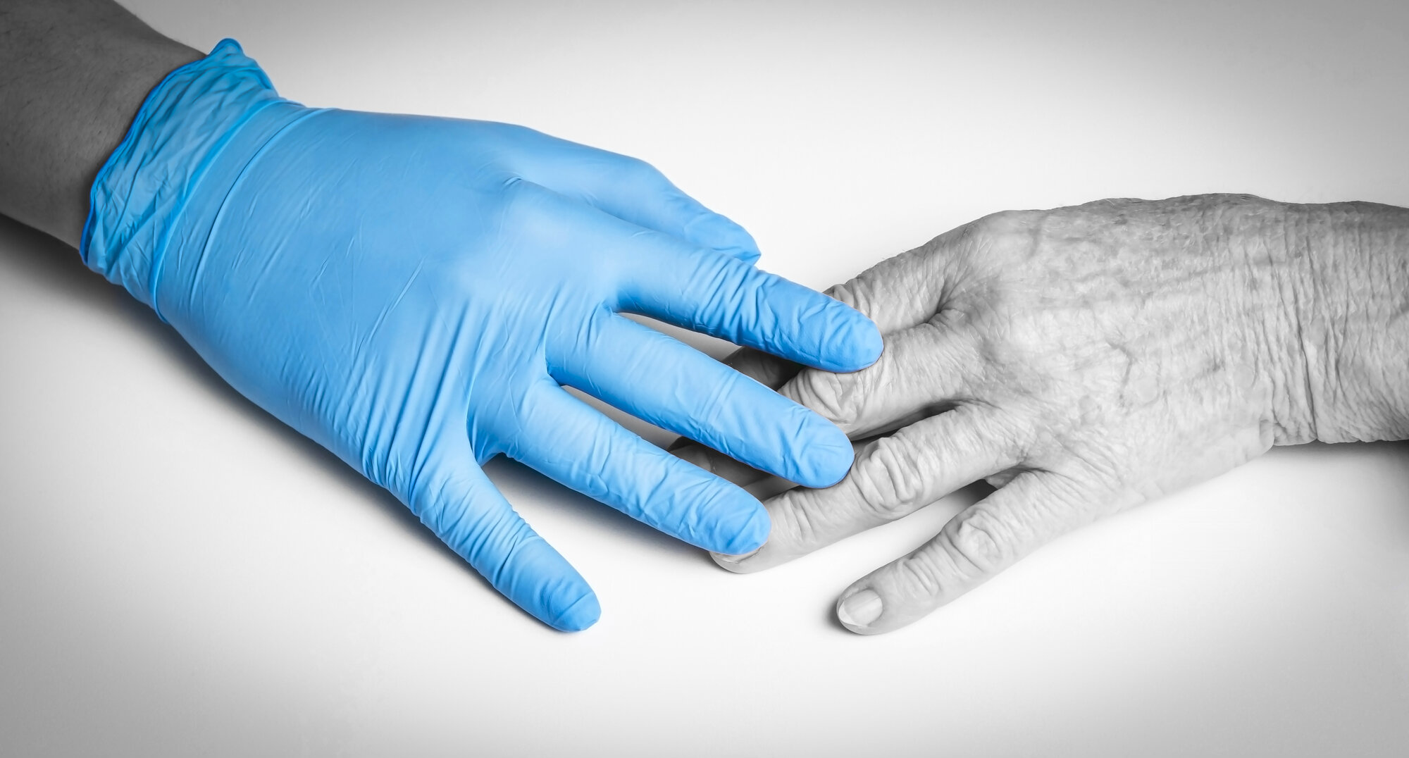 Bildet viser en hånd iført en plasthanske som berører hånden til et eldre menneske