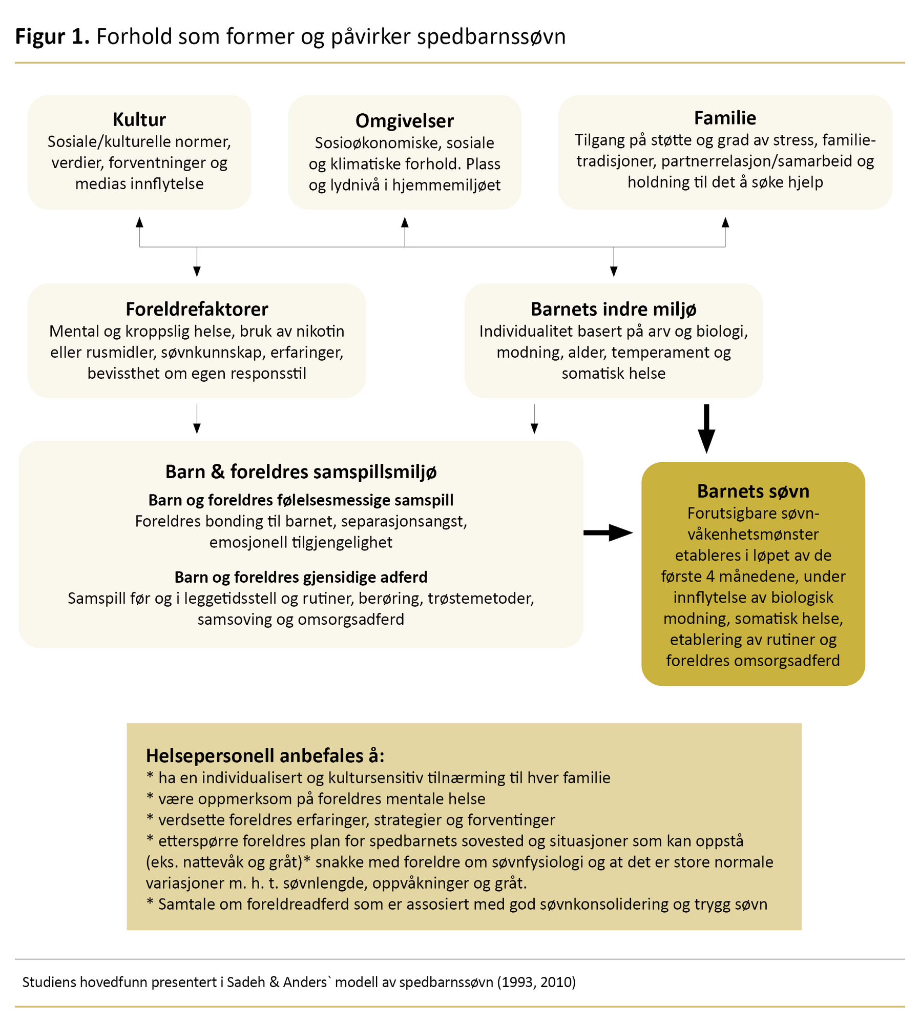 Hovedfunnet er oppsummert i figuren, og den viser hvilket komplekst fenomen spedbarnssøvn er. Søvn hos både barn og foreldre påvirkes av omgivelsesfaktorer (kultur, familieforhold og bomiljø), hvordan helsepersonell kommuniserer og forhold ved barnet, foreldrene og samspillet mellom dem.