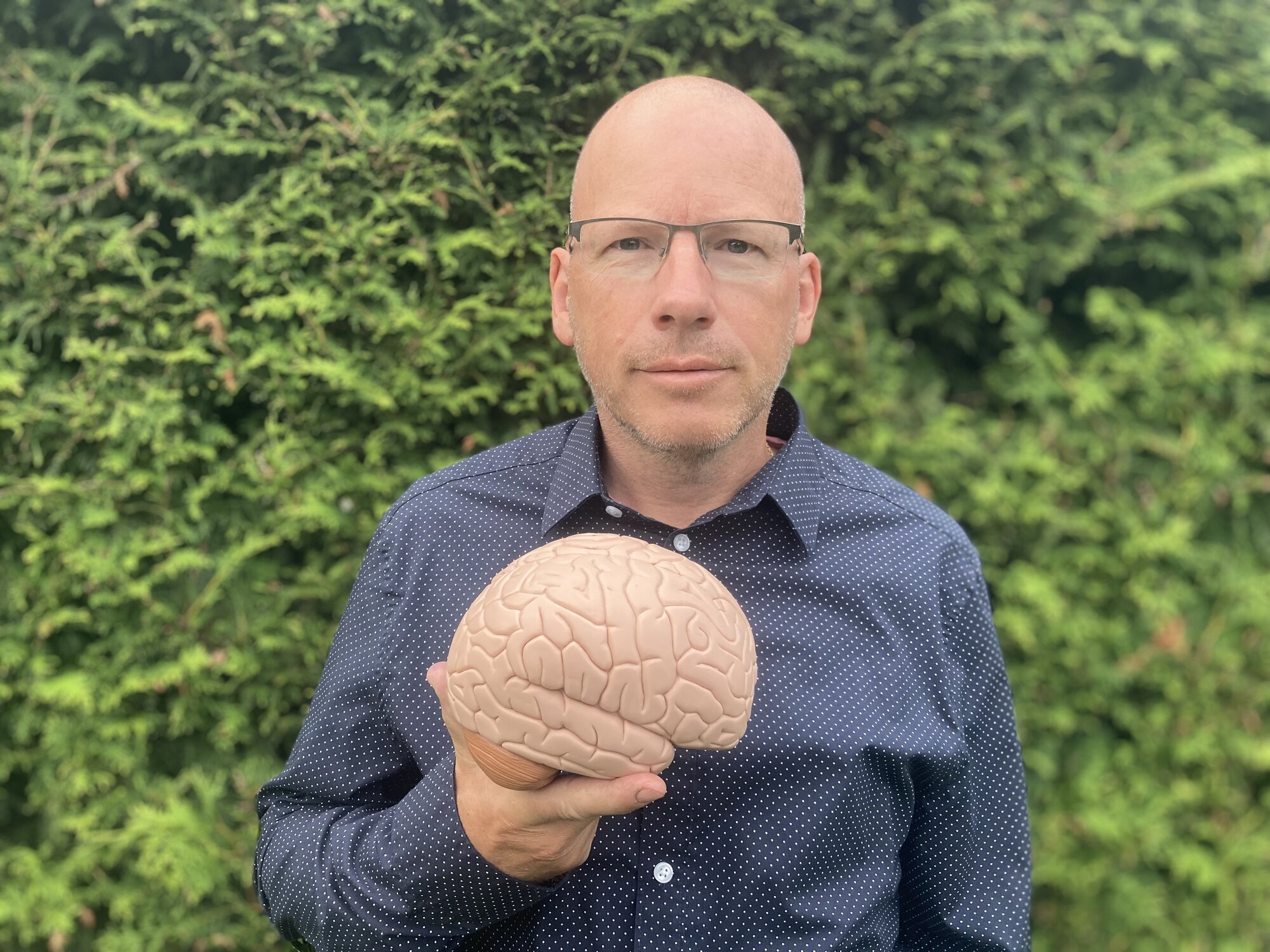 Bildet viser Tommy Skar som viser frem en plastmodell av en hjerne