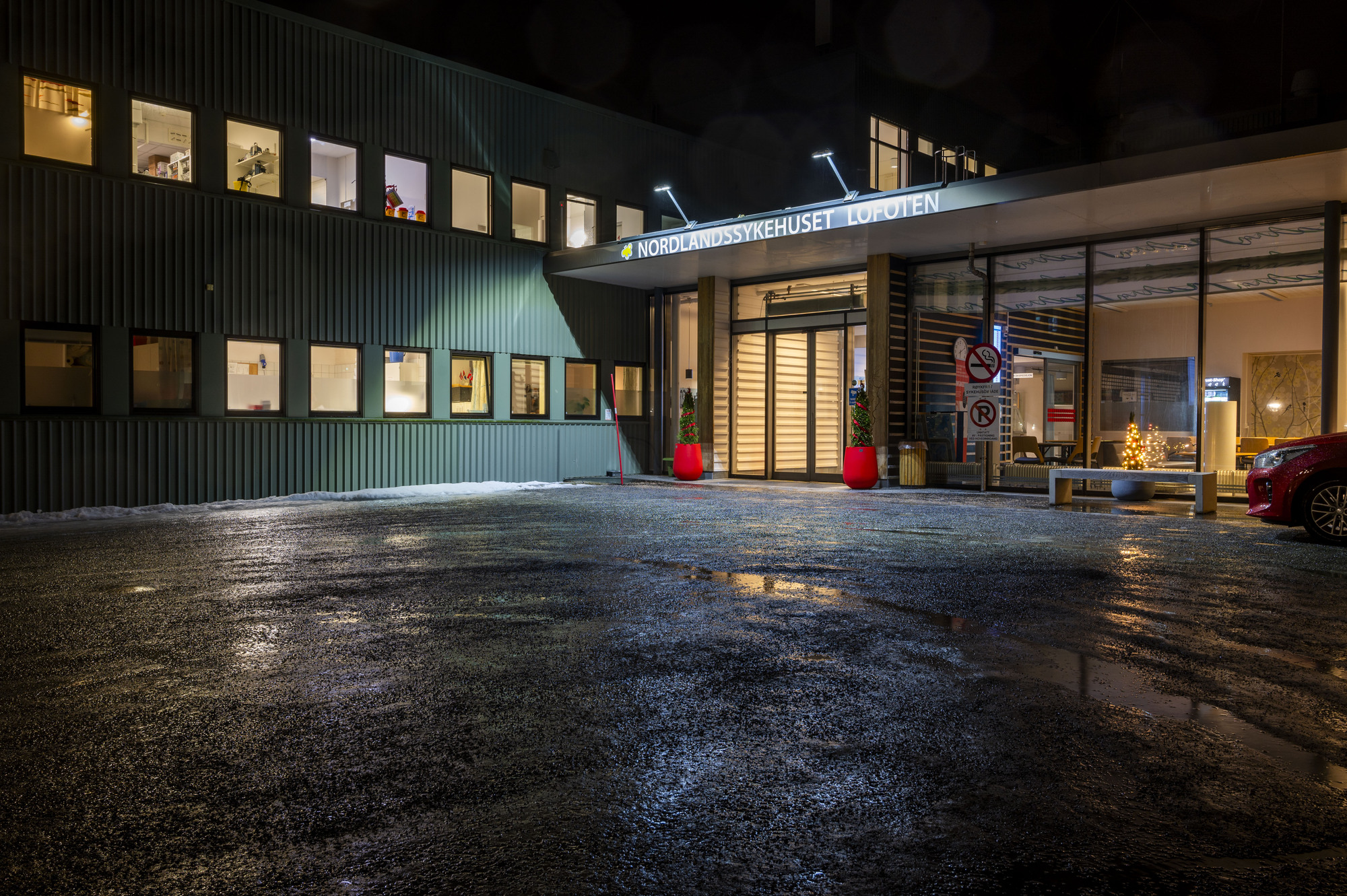 Bildet viser hovedinngangen ved Nordlandssykehuset Lofoten