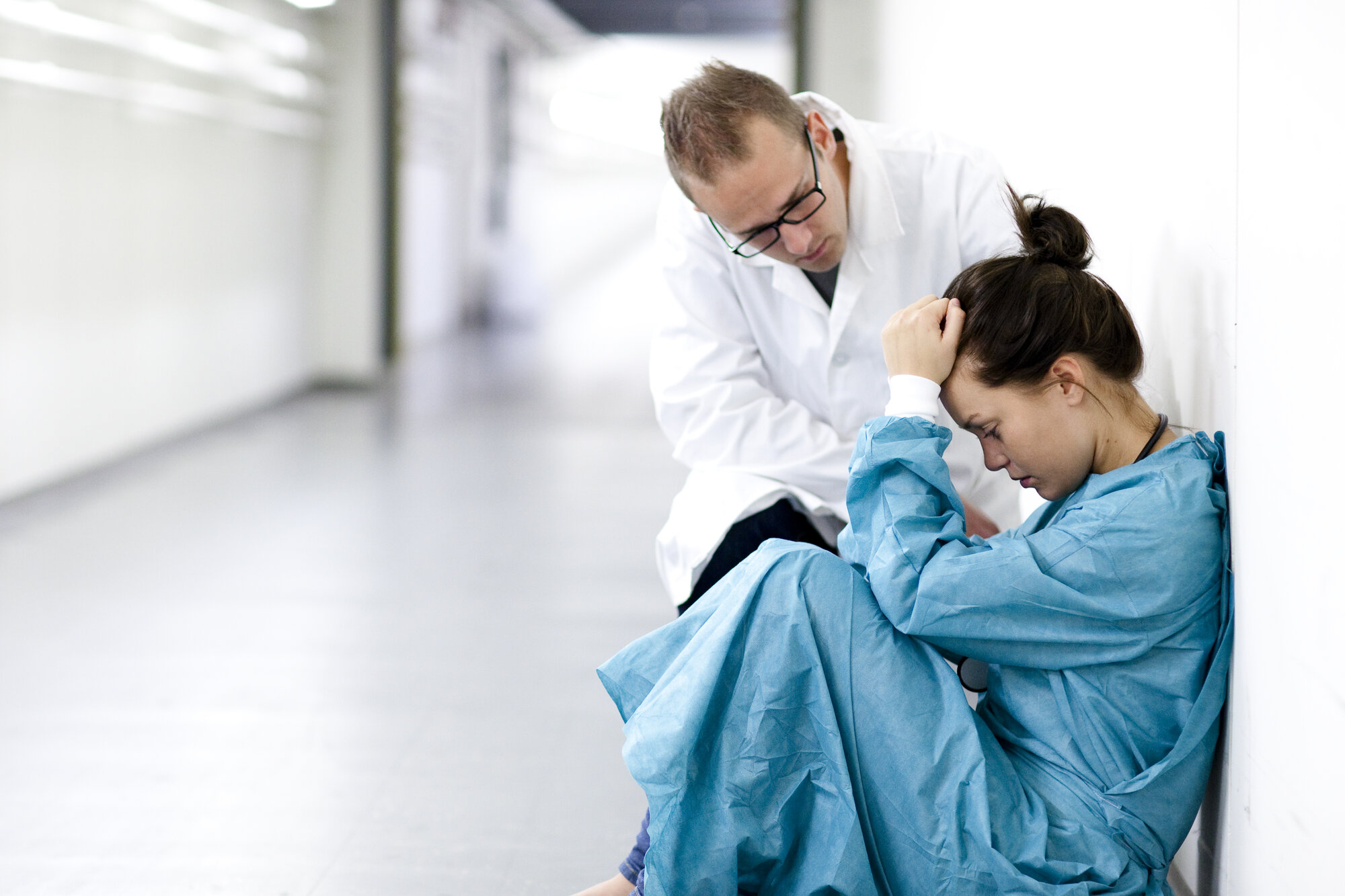 Bildet viser en kvinnelig sykehusansatt som får trøst av en mannlig i en korridor.