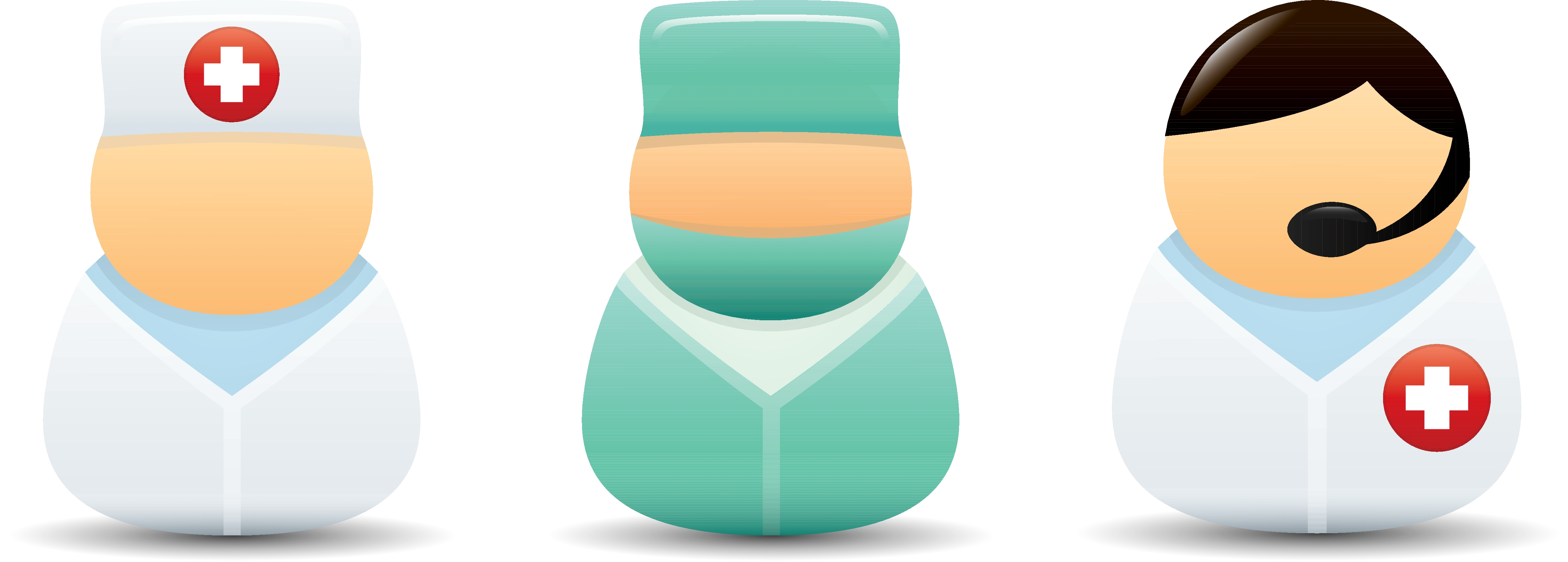 Illustrasjonen viser tre dukkeaktige figurer kledd som helsepersonell.