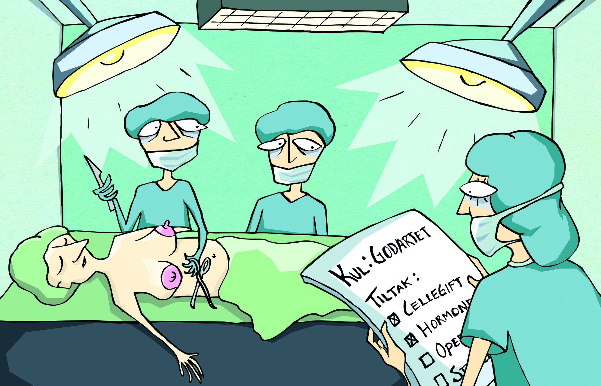 Illustrasjonen viser kirurger ved et operasjonsbord, der det ligger en kvinne som tydeligvis får fjernet en kul fra et bryst.