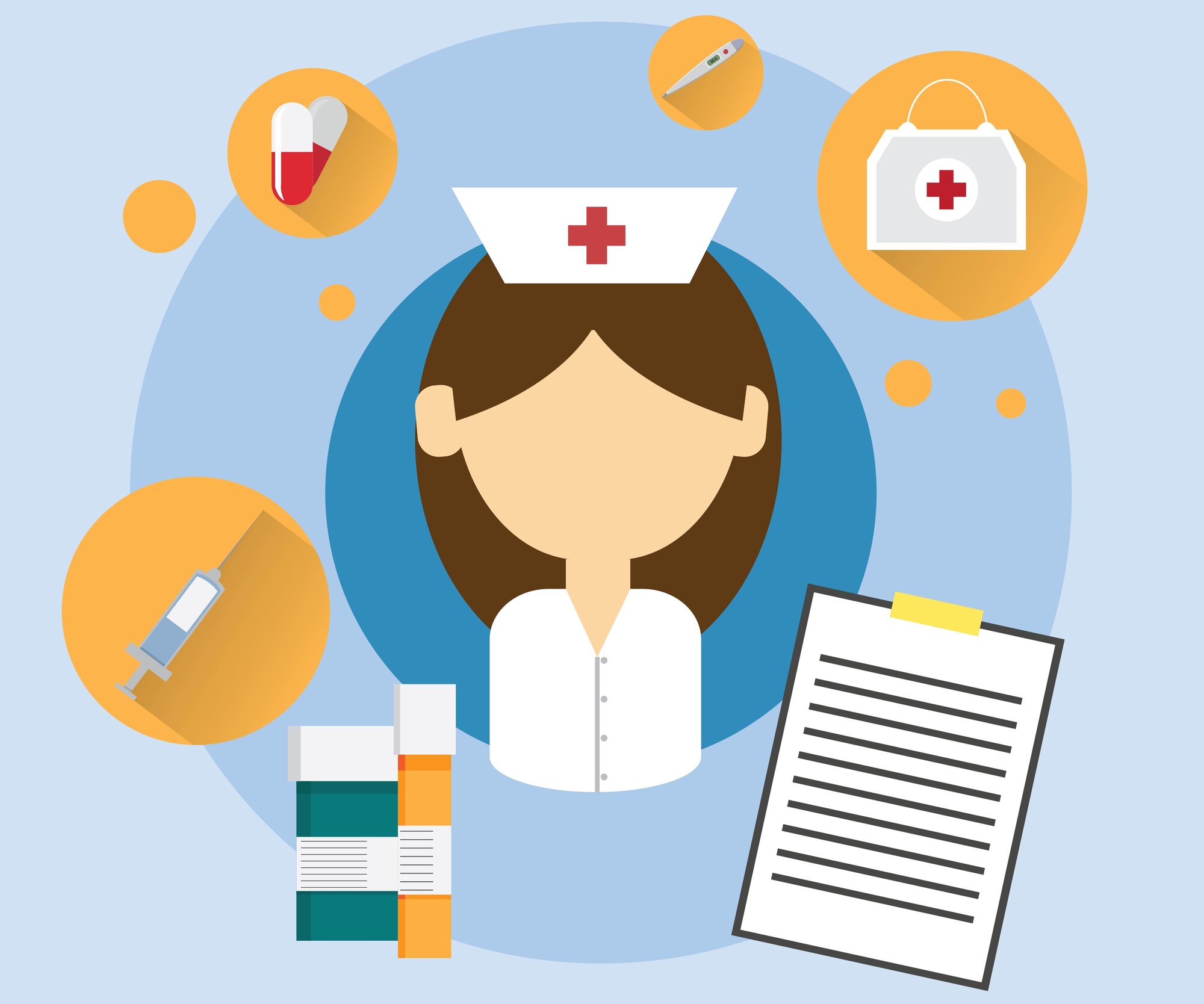 Illustrasjonen viser en sykepleier som tenker på oppgavene hun må gjøre.