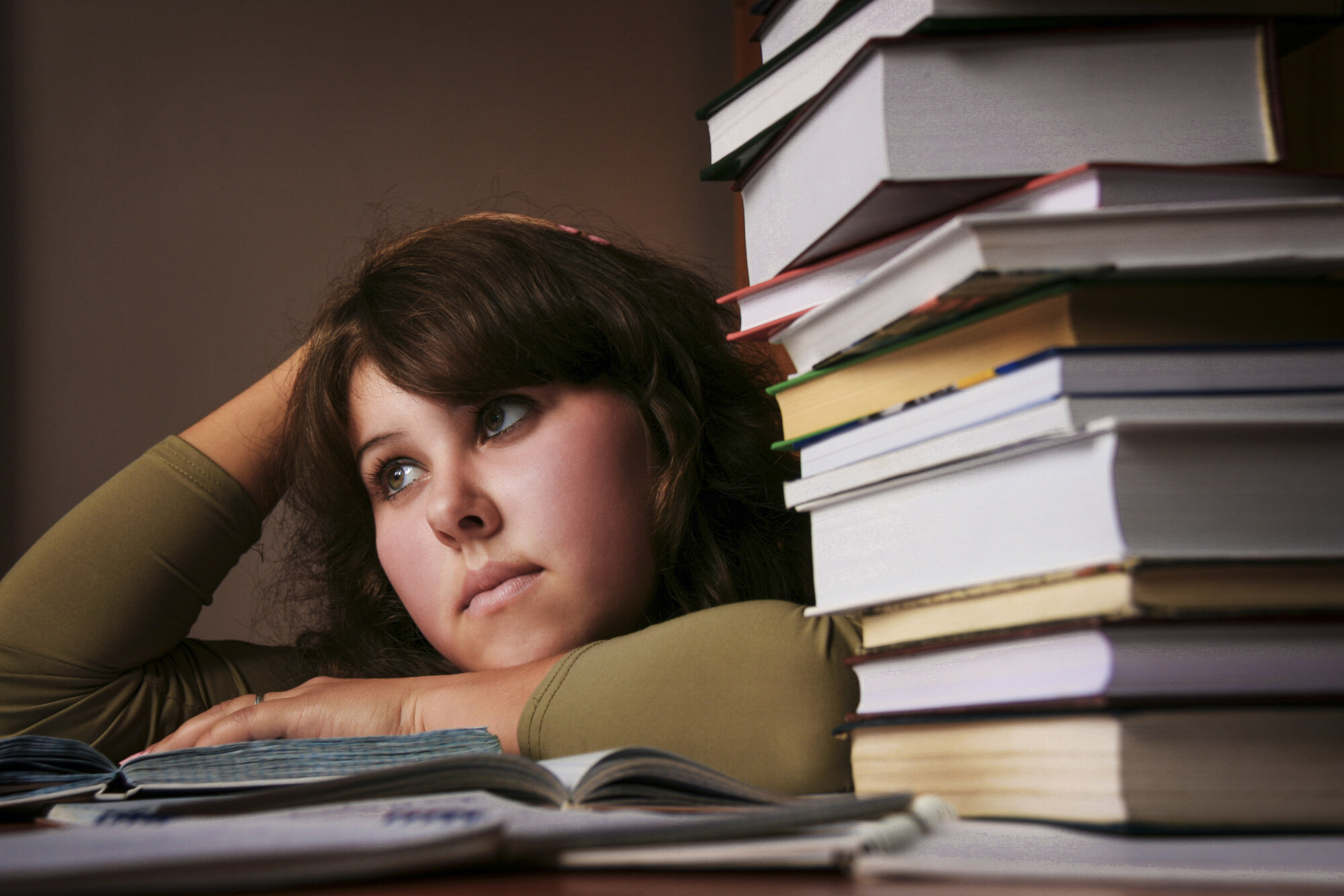 Bildet viser en student med et litt oppgitt uttrykk, som ligger over en oppslått bok på pulten. Det ligger en stabel bøker ved siden av henne.