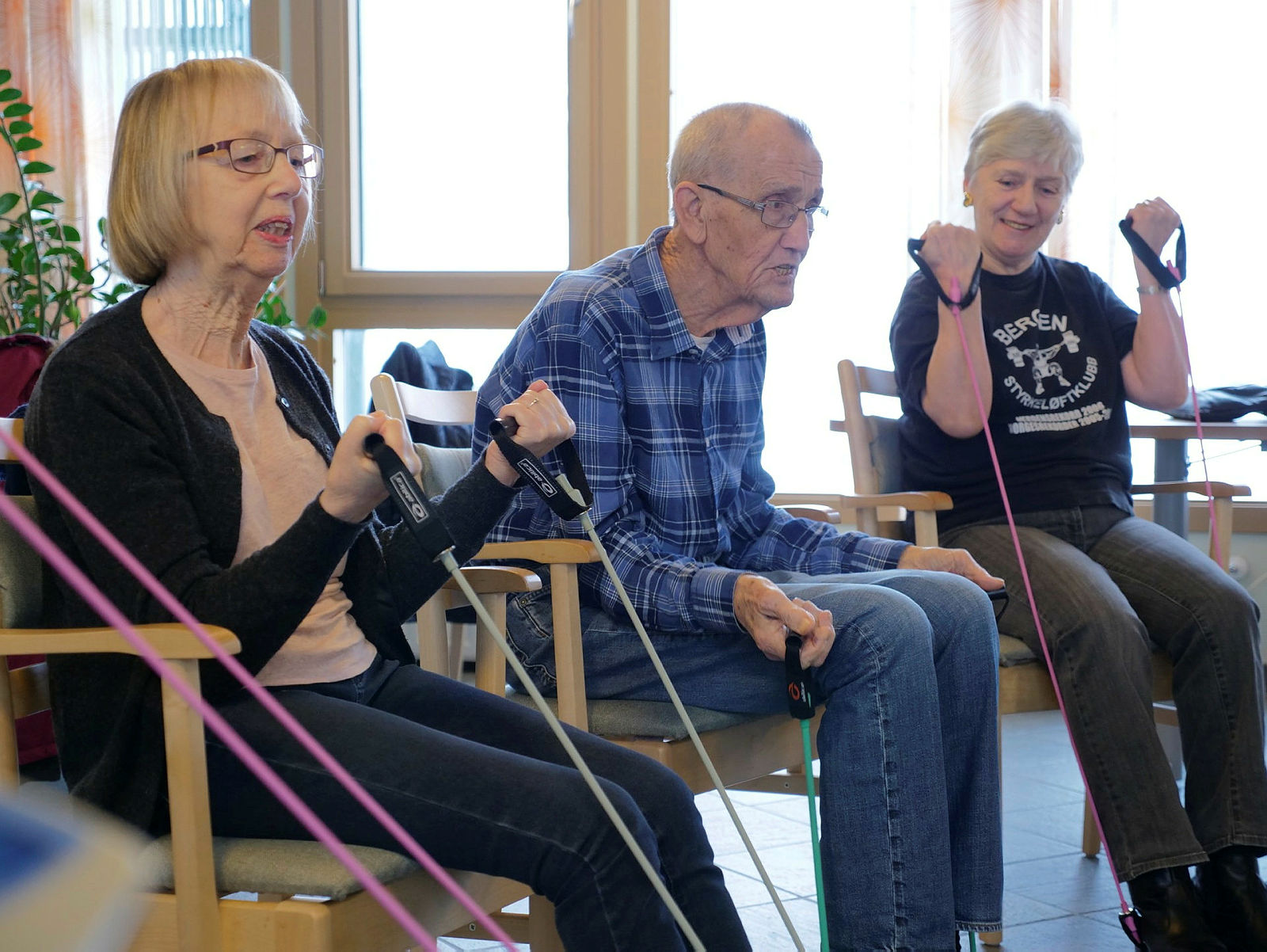 Styrketrening på sykehjem kan gjøres med enkle midler. Alt du trenger er strikk og musikk.