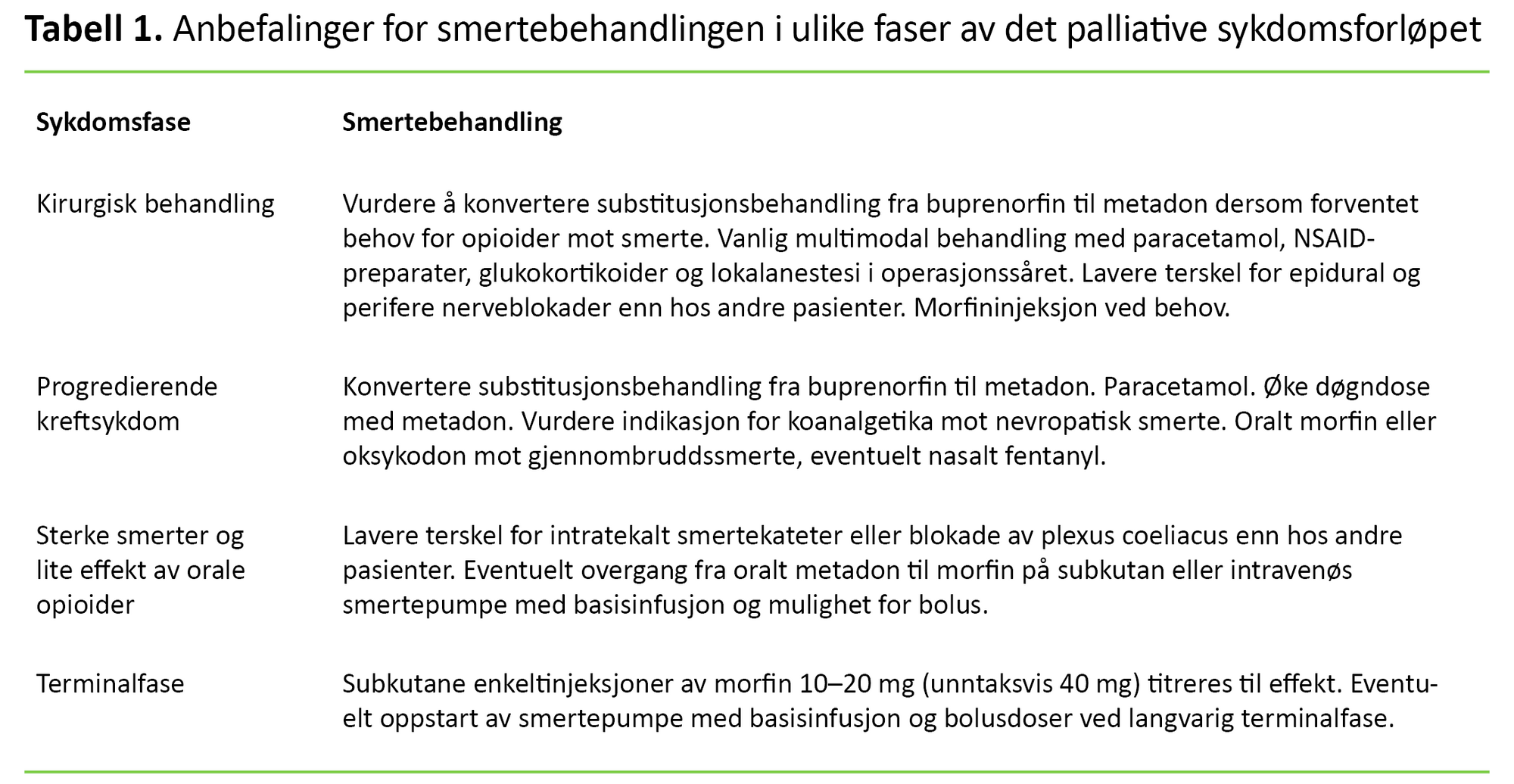 I en fersk systematisk oversiktsartikkel konkluderte forskere med at det var svært lite kunnskapsgrunnlag fra kliniske studier på hvordan smerte bør lindres hos LAR-pasienter i palliativ fase, men noe dokumentasjon som støtter bruk av metadon til både substitusjonsbehandling og smertelindring (3). Imidlertid presenterte ikke forskerne i artikkelen konkrete råd for bruk av smertestillende legemidler i de ulike fasene av det palliative sykdomsforløpet.