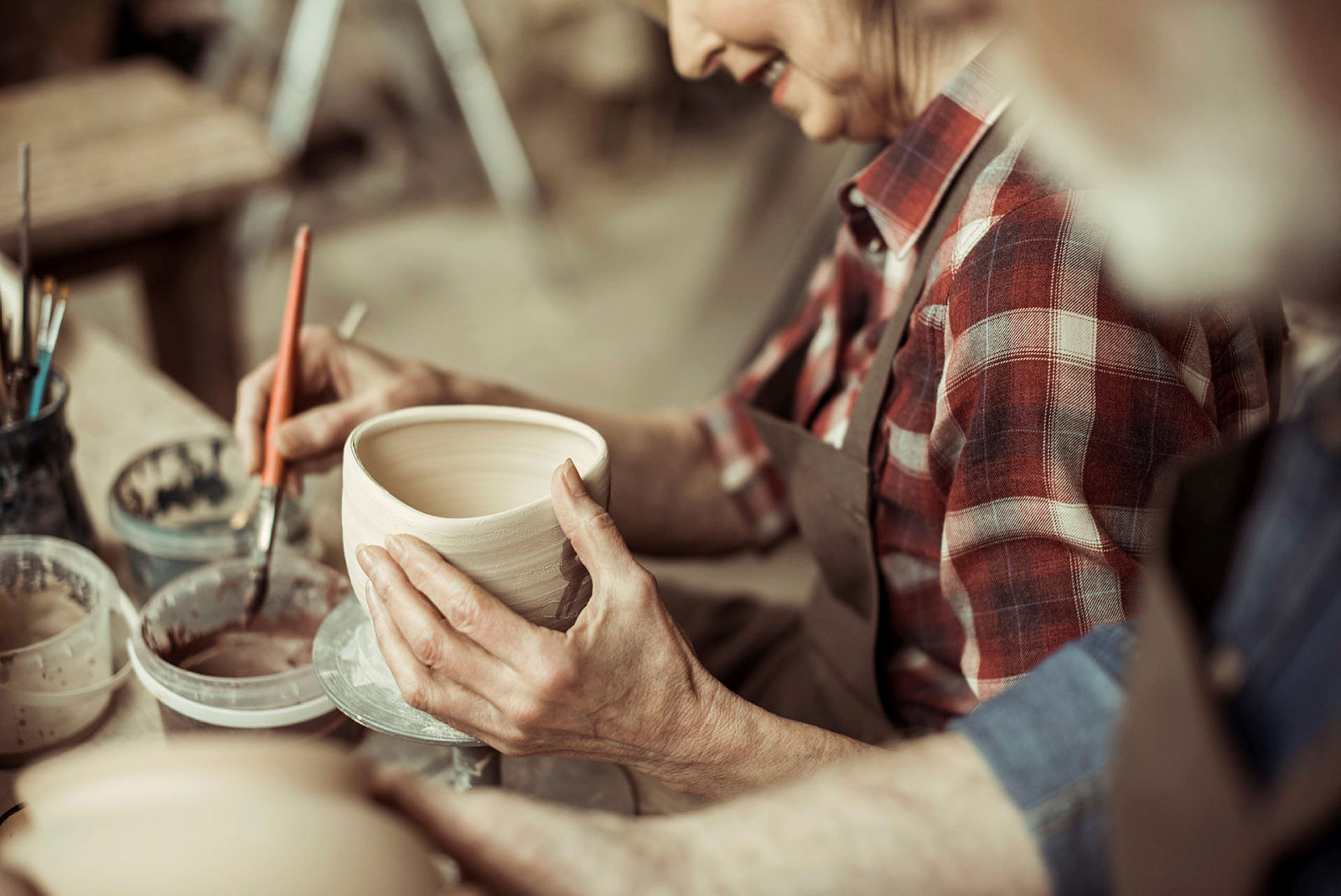 Bildet viser en eldre kvinne og en eldre mann som lager og dekorerer gjenstander i leire