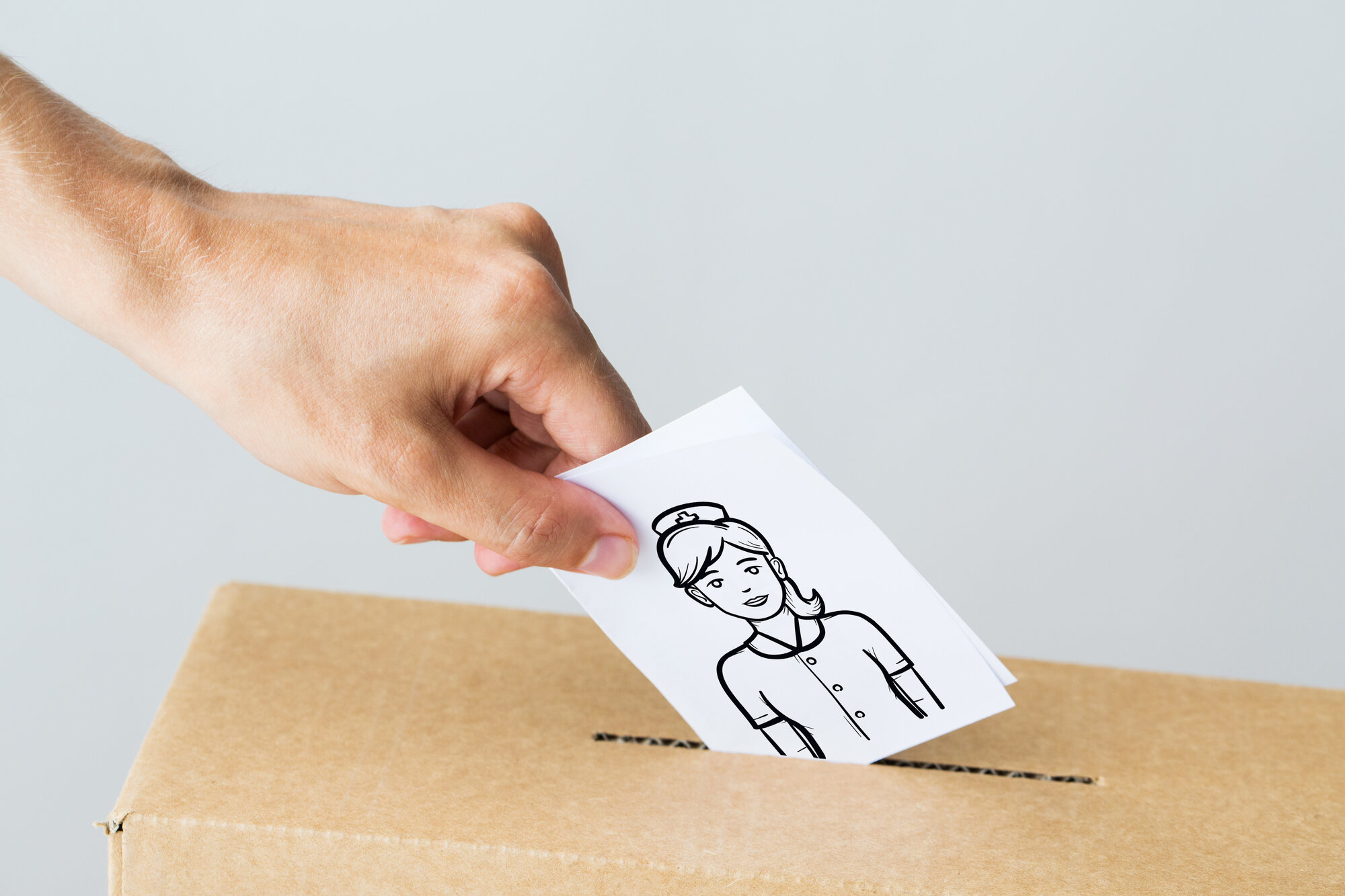 Bildet viser en hånd som slipper en stemmeseddel ned i en papireske. På stemmeseddelen er det bilde av en sykepleier.