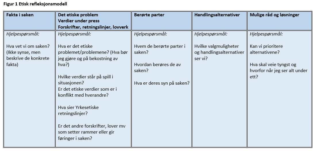NSF har en femtrinnsmodell som vist under. Verktøyet kan hjelpe den enkelte sykepleier til å: identifisere et etisk dilemma, oppsummere fakta i saken, se hvilke berørte parter som er involvert, peke på hvilke verdier som står på spill og sist, men ikke minst angi hvilke handlingsalternativer og mulige løsninger.