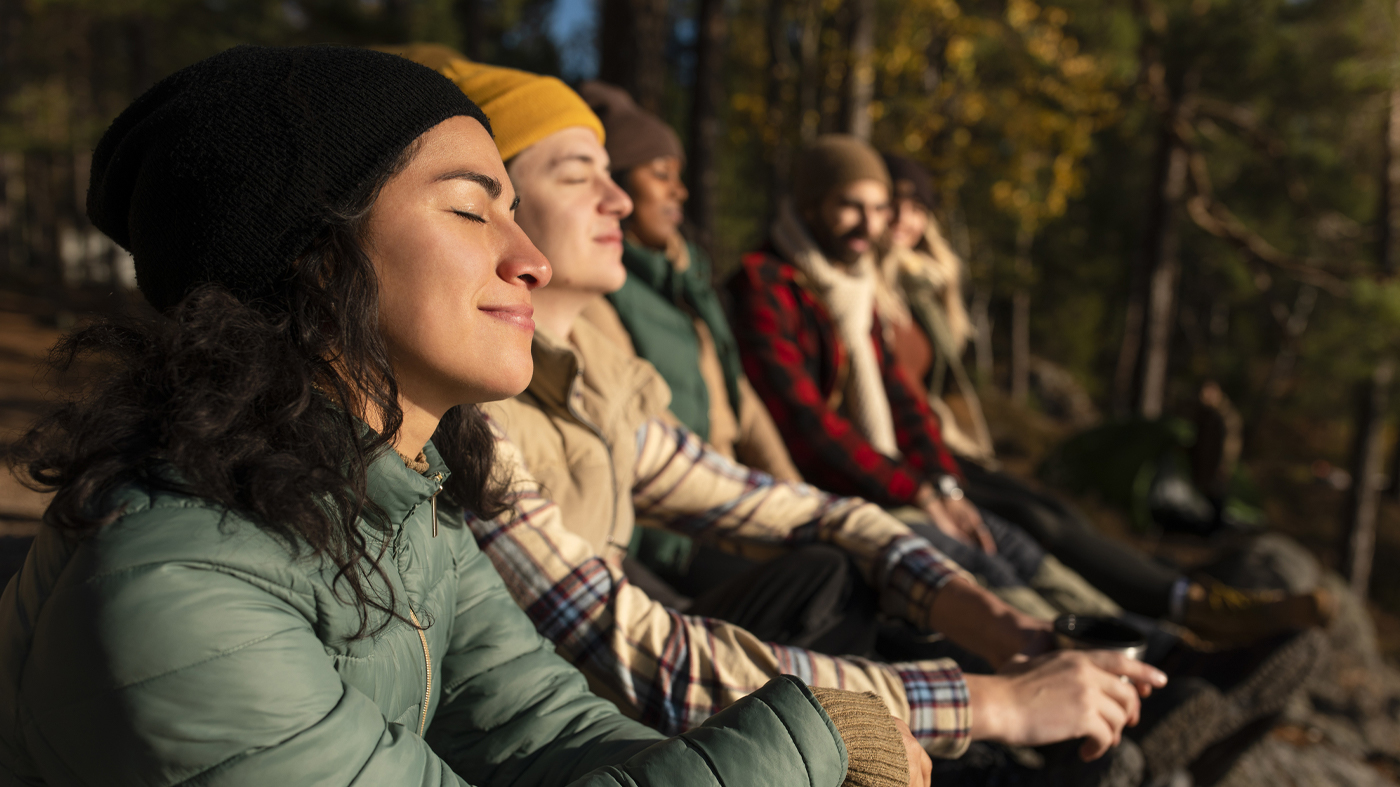Bildet viser flere mennesker som sitter ute og nyter naturen i stillhet.