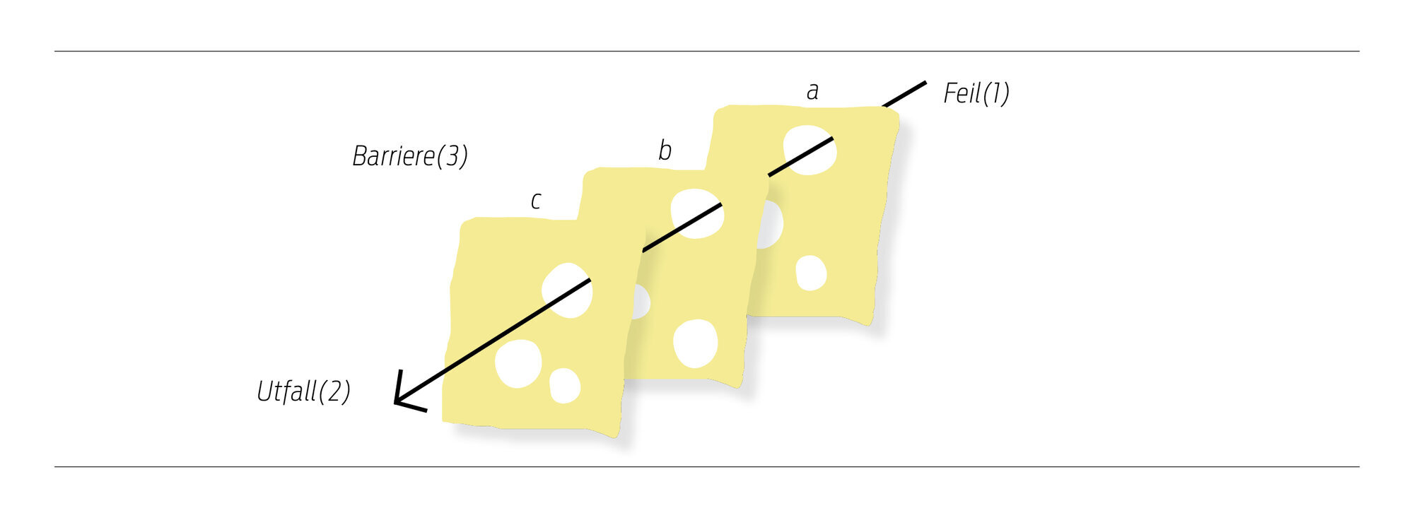 Den britiske psykologen James Reason har utviklet en modell for å analysere slike situasjoner (7). Han kaller den for sveitserost-modellen. (Se figur.) I sin enkleste form har den tre komponenter. Den skildrer (1) feilen og (2) det negative utfallet som kan følge av den, og (3) barrieren som kan bygges mellom disse to, slik at årsakskjeden fra (1) til (2) avbrytes.