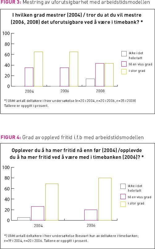 Resultat: Henholdsvis 58, 48 og 56 prosent av respondentene ønsket å benytte seg av TB. Nesten alle (86-100 prosent) mestret, eller antok de ville mestre, uforutsigbar arbeidstid godt. De fleste timebankdeltakere (95-100 prosent) erfarte at de hadde mer fritid med TB, og 91 prosent opplevde økt trygghet på vaktene ved at det var flere kjente sykepleiere til stede. Ni sykepleiere økte sin stillingsprosent på grunn av tilrettelegging for TB.