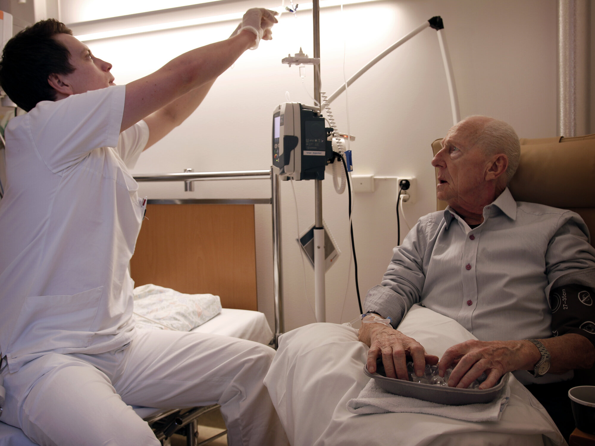 Oppe i femte etasje er dagens kur ferdig. Nå skal de hjem. Hendene er kalde etter å ha sittet lenge med fingertuppene i boksen med isbiter. Isbitene er for å redusere blodstrømmen til fingrene. Cellegiften han får kan påvirke perifere nerver og føre til smerter eller nummenhet og sprukne negler.